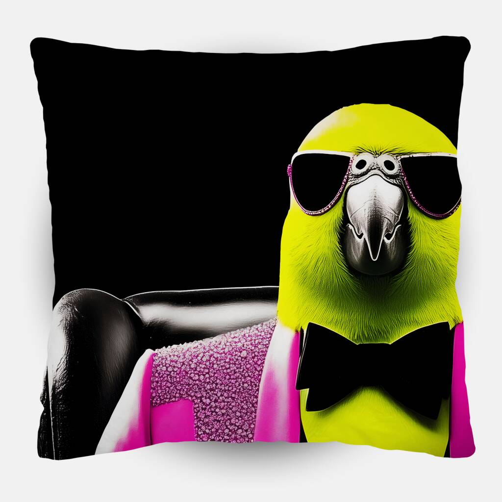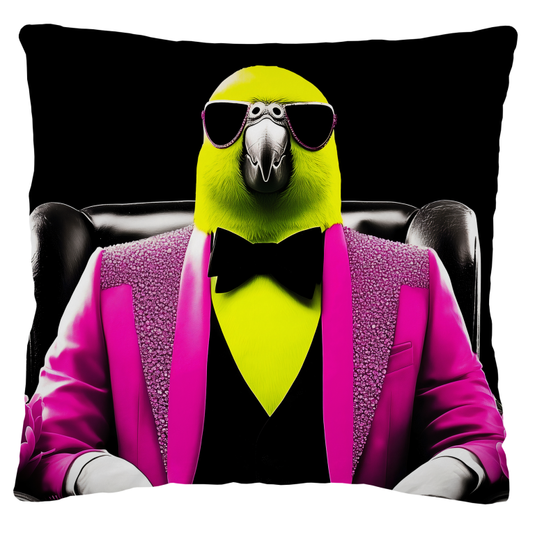 Een levendig, surrealistisch portret van een kanarie in een opvallende roze smoking met glinsterende accenten. De vogel, gezeten in een lederen fauteuil, straalt zelfverzekerdheid en glamour uit, versterkt door een zonnebril en een zwarte strik. Het contrastrijke kleurenschema van fel geel en roze op een donkere achtergrond geeft het werk een moderne, humoristische en bijna koninklijke uitstraling.