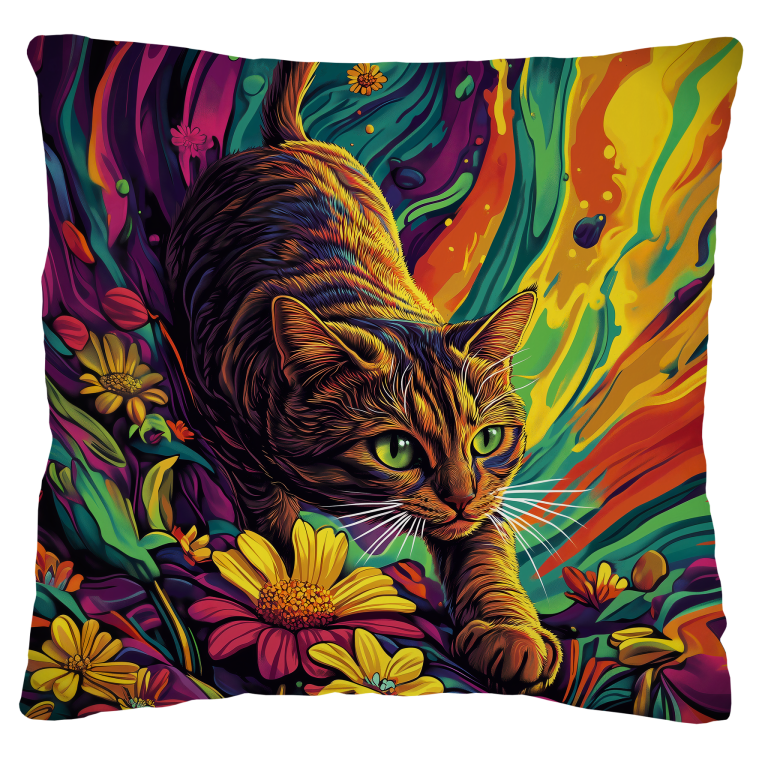 Een levendig en kleurrijk kunstwerk waarin een kat centraal staat. De kat beweegt sierlijk tussen felgekleurde bloemen, met haar ogen gefocust en alert. De achtergrond heeft een psychedelische uitstraling met vloeiende patronen en een mix van intense kleuren zoals oranje, geel, blauw en paars. De combinatie van realisme en abstractie geeft het schilderij een dromerige en dynamische sfeer, waardoor het zowel speels als mysterieus aanvoelt. Perfect voor liefhebbers van kunst en katten!