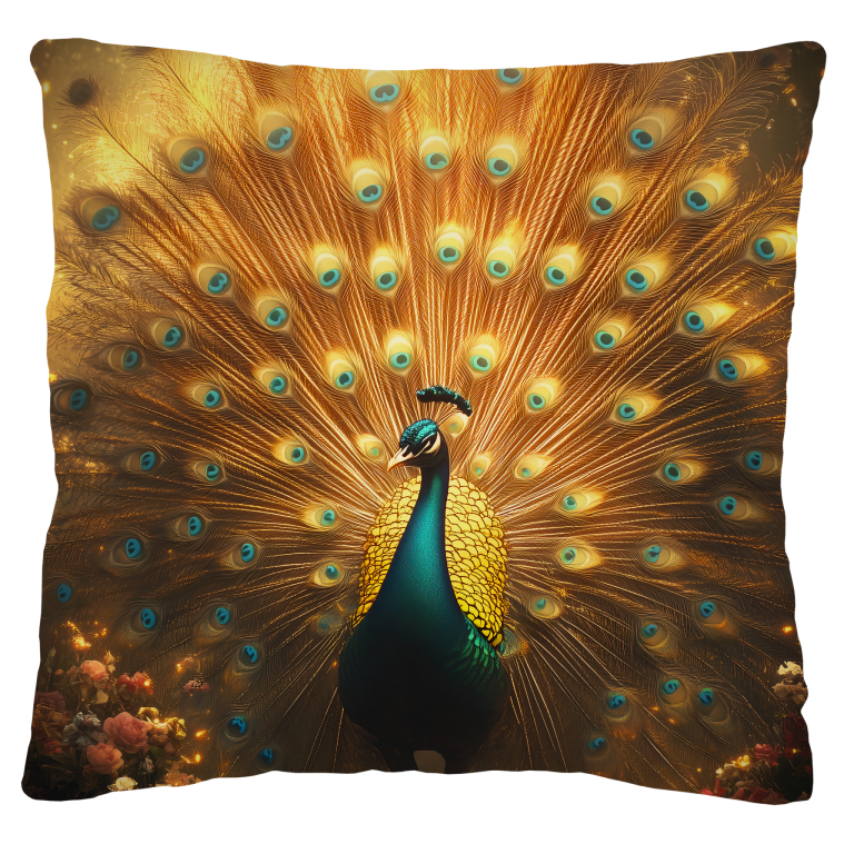 Golden Peacock toont een majesteitelijke pauw in volle pracht, waarbij zijn imposante staart zich als een waai van goudkleurige juwelen ontvouwt. Elke veer schittert met turquoise oogvlekken die contrasteren met de warme gouden gloed die de hele scène omhult. De mystieke sfeer wordt versterkt door zwevendedeeltjes licht die als stof van sterren door de compositie dansen. Dit koninklijke kunstwerk belichaamt elegantie, trots en natuurlijke grandeur en brengt een vleugje luxe in elke ruimte.