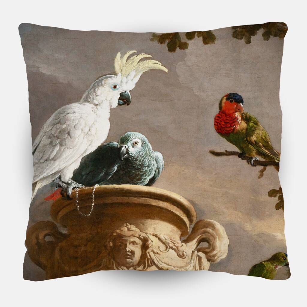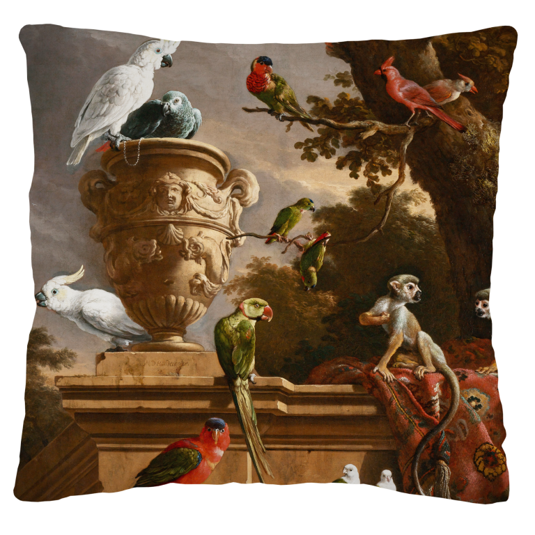 De Menagerie brengt een klassieke scène uit de Gouden Eeuw tot leven waarin een verzameling exotische dieren zich verzamelt rond een siertuin met monumentale architectuur. Kaketoes, apen, papegaaien en andere tropische dieren bevolken dit levendige tafereel, waarbij elke soort met een verbluffende aandacht voor detail is weergegeven. De warme aardtinten en de rijke texturen van het baroque landschap creëren een sfeer van verfijnde elegantie en klassieke grandeur. Dit meesterwerk toont de fascinatie van de oude meesters voor de exotische dierenwereld.