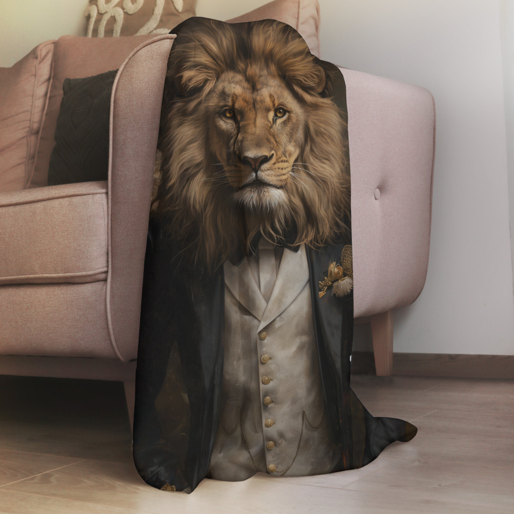 Husband of the Jungle combineert klassieke elegantie met wilde kracht door een statige leeuw in een verfijnd zwart pak met een crèmekleurig gilet en gouden accenten af te beelden. Zijn imposante manen vloeien naadloos over in het aristocratische silhouet, waardoor een intrigerend contrast ontstaat tussen de ruwe majesteit van de jungle en de verfijning van een edelman. De subtiele bloemendecoratie en de warme, klassieke achtergrond geven het geheel een tijdloze en vorstelijke uitstraling, waardoor het beeld zowel mysterieus als indrukwekkend aanvoelt.