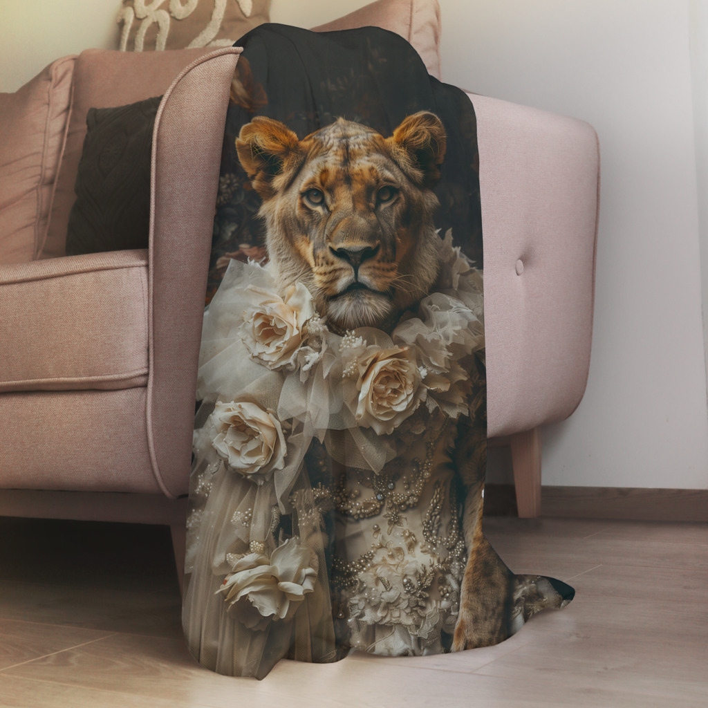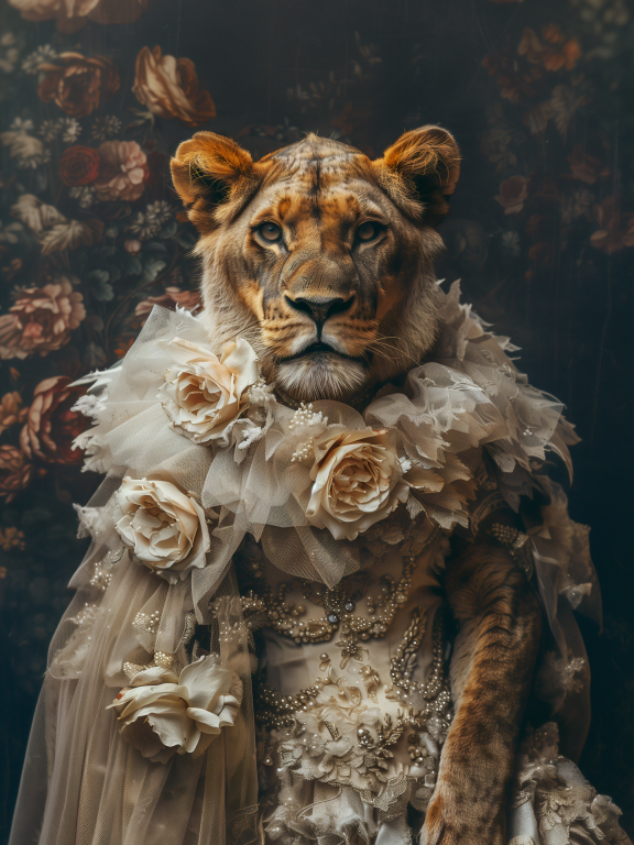 Wife of the Jungle is een indrukwekkend portret waarin de kracht en elegantie van een leeuwin worden gecombineerd met de verfijning van klassieke mode. De leeuwin draagt een weelderige jurk versierd met delicate parels, kant en volumineuze bloemen, wat haar een koninklijke uitstraling geeft. De achtergrond met donkere, bloemrijke patronen versterkt het gevoel van tijdloze luxe. Haar doordringende blik en zelfverzekerde houding maken het portret tot een krachtige samensmelting van wilde schoonheid en aristocratische grandeur, waarbij de natuurlijke majesteit van de jungle samenkomt met menselijke verfijning.