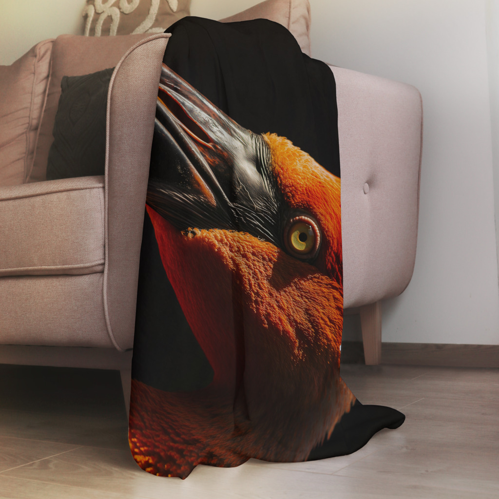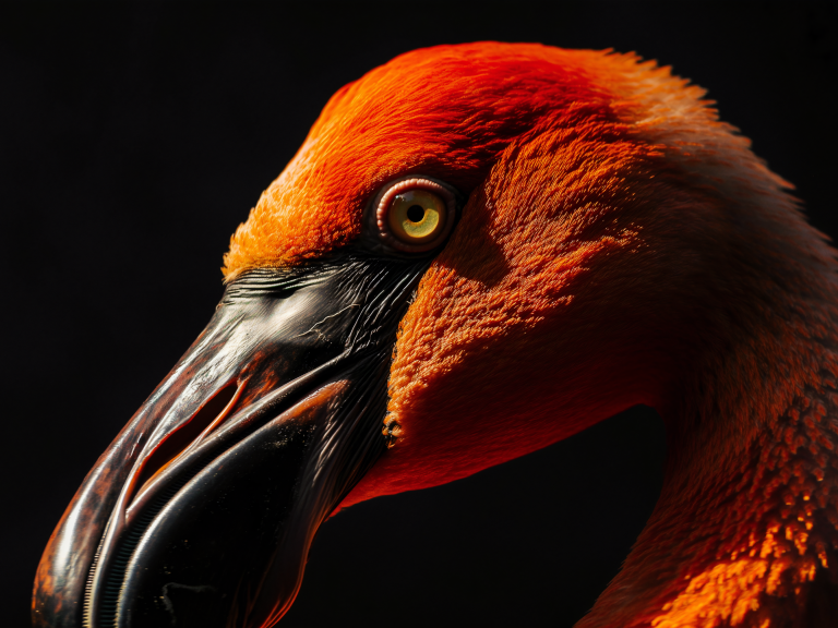 Dark Flamingo toont een close-up van een majestueuze flamingo, gehuld in een diep zwart achtergrond die de vurige oranjerode tinten van zijn veren benadrukt. Het scherpe contrast tussen licht en schaduw accentueert de textuur van de veren en de intense blik in het oog van de vogel, waardoor een hypnotiserend effect ontstaat. De gebogen snavel met zijn glanzende zwarte oppervlak voegt een extra laag van elegantie en mysterie toe. Dit kunstwerk straalt kracht en verfijning uit, waardoor het een opvallend en intrigerend element vormt in elk interieur.