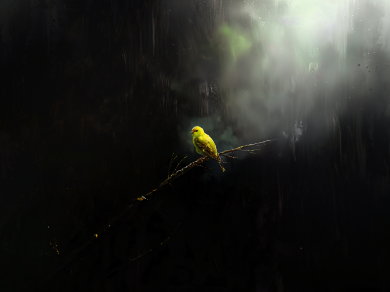 Lonely Bird toont een moment van contemplatie waarin een felgele vogel rust op een kale tak, omgeven door mysterieuze schaduwen en zacht gefilterd licht. Het dramatische contrast tussen het heldere vogeltje en de donkere, mistige omgeving creëert een atmosfeer van verstilde schoonheid en melancolie. Dit poëtische beeld spreekt tot de ziel en herinnert ons aan de kracht van eenzaamheid en reflectie. Perfect voor wie houdt van emotionele diepgang en natuurlijke symboliek in hun kunst.
