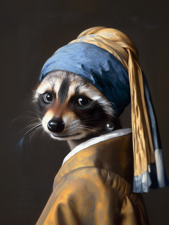 Pearly Raccoon presenteert een charmante hommage aan Vermeers beroemde Meisje met de Parel, waarbij een schattige wasbeer de plaats inneemt van het iconische model. De klassieke compositie wordt behouden met de karakteristieke blauwe hoofddoek en de mysterieuze parel, terwijl de ondeugende uitdrukking van de wasbeer een humoristische twist toevoegt aan dit tijdloze meesterwerk. De rijke kleuren en de meesterlijke lichtval tonen respect voor de originele schildertechniek. Dit speelse kunstwerk combineert klassieke kunstgeschiedenis met moderne humor en brengt een glimlach in elke ruimte.