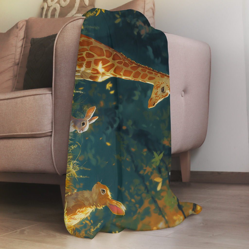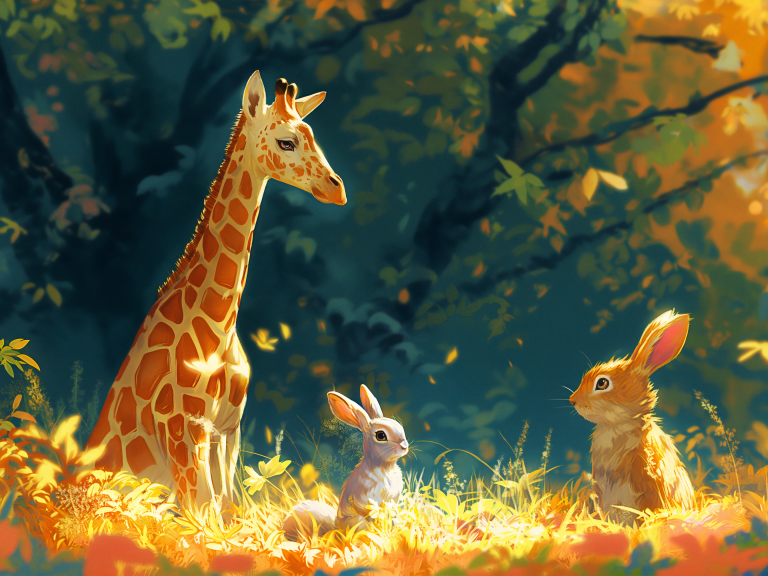 Happy Bunch toont een vrolijke scène waarin een majestueuze giraffe vriendschap sluit met een groep konijnen in een gouden herfstlandschap. De warme zonnestralen filteren door het gebladerte en creëren een magische atmosfeer waarin verschillende diersoorten samen vreedzaam samenleven. De rijke herfstkleuren en de zachte belichting geven het kunstwerk een sprookjesachtige kwaliteit die pure vreugde en harmonie uitstraalt. Dit hartverwarmende tafereel brengt de schoonheid van vriendschap en de magie van de natuur in je interieur.