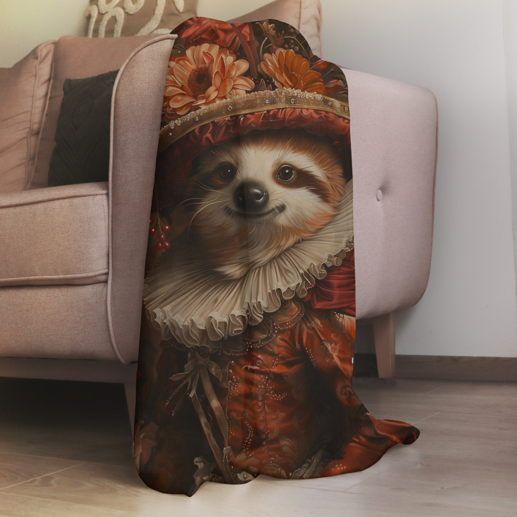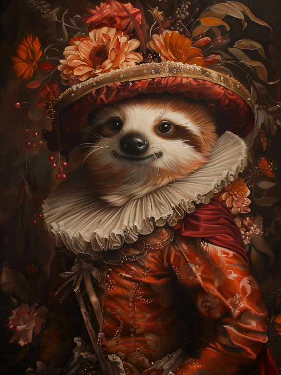 Het schilderij toont een schattige luiaard in een rijkelijk versierde, historische outfit. De luiaard draagt een prachtig barokke jurk in warme tinten rood en goud, met gedetailleerde patronen en sierlijke plooien. Een opvallende brede kraag en een elegante hoed, versierd met bloemen, maken de koninklijke uitstraling compleet. De achtergrond is gevuld met donkere, warme tinten en florale elementen, wat het schilderij een klassieke, bijna aristocratische sfeer geeft. De combinatie van het dier en de luxe kleding zorgt voor een speelse, bijna sprookjesachtige uitstraling.