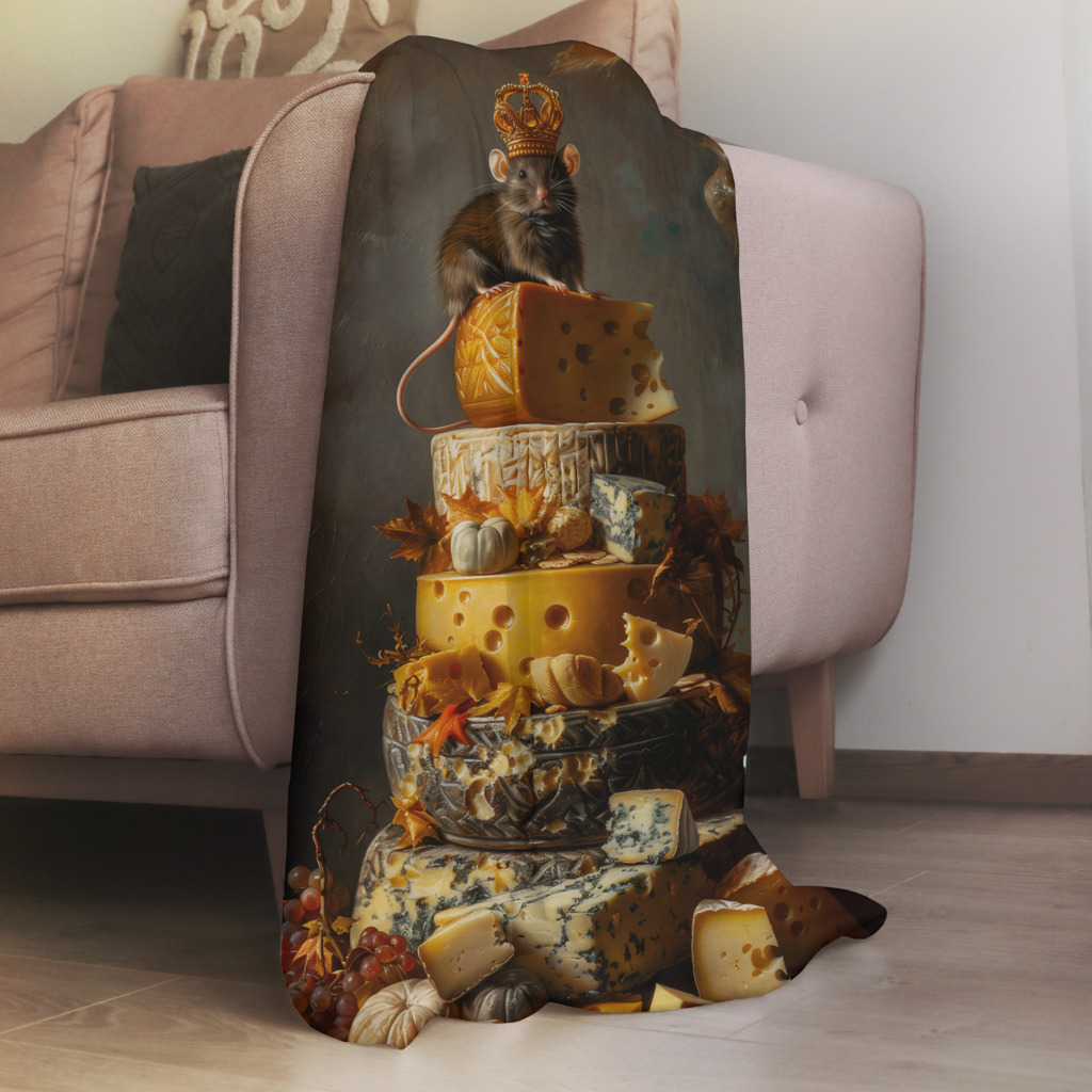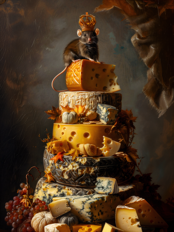 King of Cheese toont een charmante muis die trots een gouden kroon draagt terwijl hij de baas speelt over een indrukwekkende toren van verschillende kaassoorten. Van brie tot cheddar, van geitenkaas tot blauwe kaas, elke variƫteit is met verbluffende precisie weergegeven in dit humoristische stilleven. De warme belichting en de rijke texturen geven elke kaas een verleidelijke glans, terwijl de kleine koning met koninklijke waardigheid over zijn culinaire koninkrijk waakt. Dit speelse kunstwerk combineert humor met oog voor detail en brengt een glimlach in elke keuken of eetkamer.