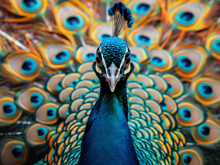 Look at Me presenteert een trotse pauw die zijn spectaculaire verenpracht tentoonspreidt in een explosie van turquoise en gouden tinten. De hypnotiserende ogen op de veren staren je aan terwijl de vogel zelfverzekerd poseert met zijn kroon van blauwe veren. Dit majestueuze portret vangt de natuurlijke ijdelheid en schoonheid van deze koninklijke vogel in al zijn glorie. Perfect voor wie houdt van opvallende natuurfotografie en de symboliek van trots en schoonheid waardeert.