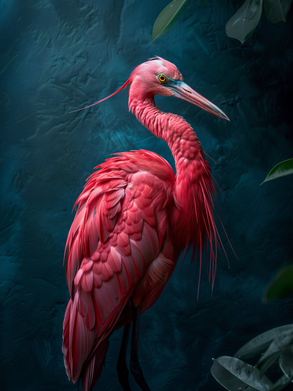 Pink Heron toont een majestueuze roze reiger in zijn volle glorie, omgeven door tropische bladeren in diepe groentinten. De intense koraalroze verentooi contrasteert prachtig met de mysterieuze donkere omgeving, waardoor elke verendetail en de elegante houding van deze prachtige vogel worden benadrukt. De hyperrealistische stijl en rijke kleuren maken dit tot een opvallend kunstwerk dat zowel natuurliefhebbers als liefhebbers van gedurfde interieurdecoratie zal bekoren.