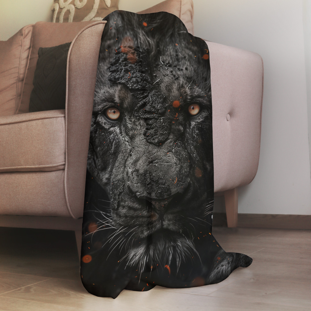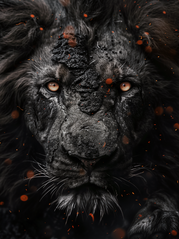 Een krachtig portret van een imposante leeuw, waarbij de intense blik direct de aandacht grijpt. De donkere, textuurrijke details en vurige oranje accenten creƫren een dramatisch contrast, wat dit kunstwerk een gedurfde uitstraling geeft. Ideaal voor wie op zoek is naar een statement piece dat kracht en mysterie toevoegt aan elke ruimte, zoals een moderne woonkamer of thuiskantoor. Perfect om een uniek, wild randje aan je interieur te geven.