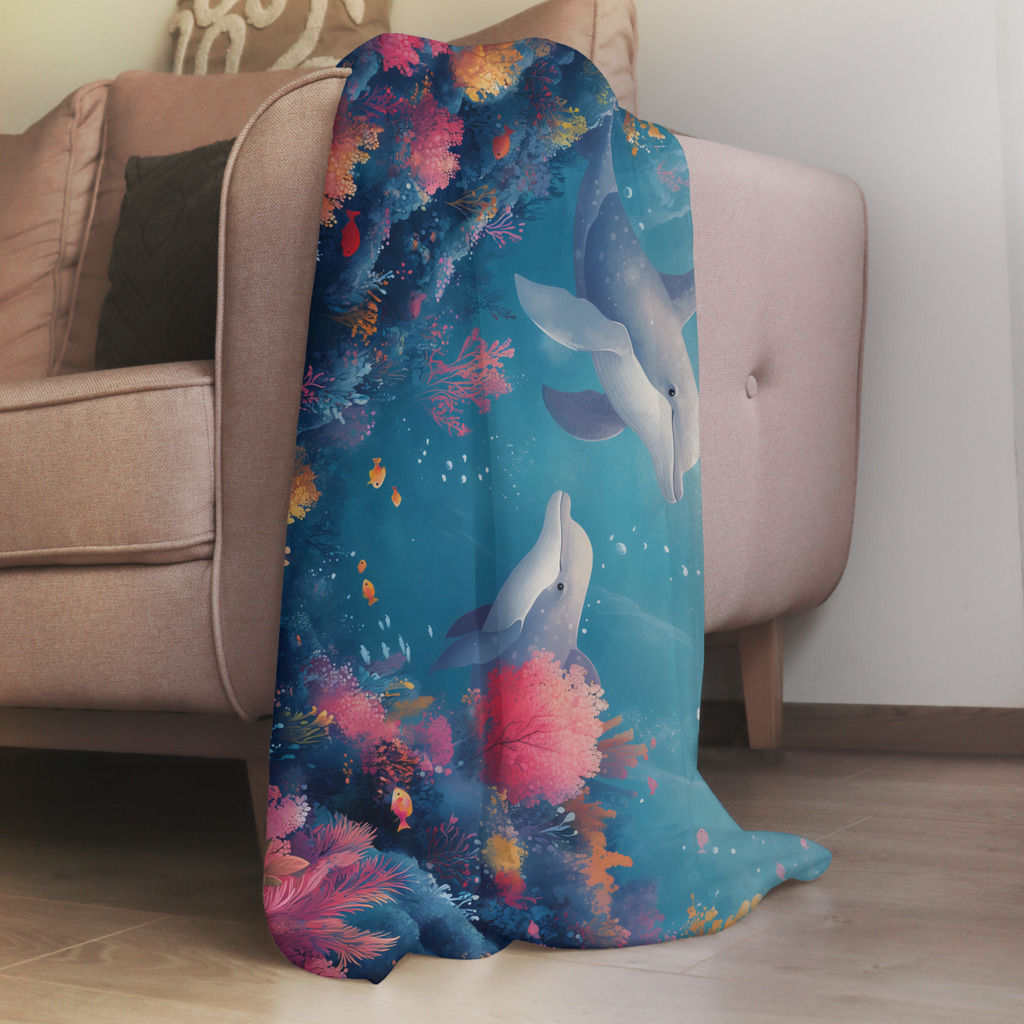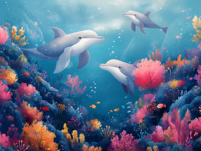 In dit betoverende onderwaterlandschap zweven drie speelse dolfijnen sierlijk door een levendig koraalrif. Omringd door een explosie van kleuren – met tinten roze, oranje, geel en blauw – straalt de scène een gevoel van rust en magie uit. Het kristalheldere water, gevuld met kleine luchtbelletjes en nieuwsgierige tropische vissen, nodigt de kijker uit om zich onder te dompelen in deze serene en dromerige oceaanwereld. De zachte gloed van het zonlicht dat door het water filtert, geeft de afbeelding een sprookjesachtige sfeer. Dit kunstwerk vangt niet alleen de schoonheid van de zee, maar ook de speelse en intelligente aard van dolfijnen, waardoor het een ware blikvanger is in iedere ruimte.