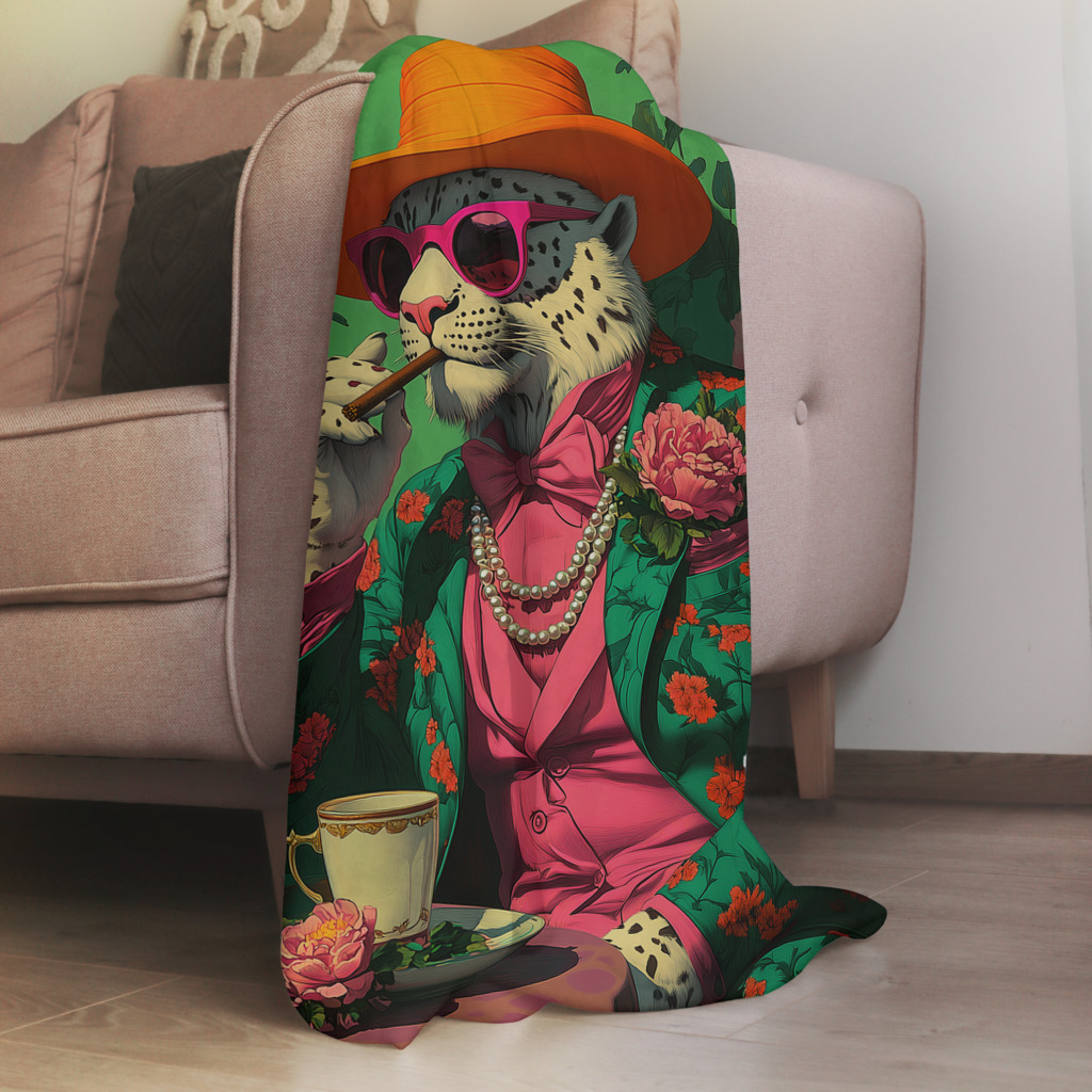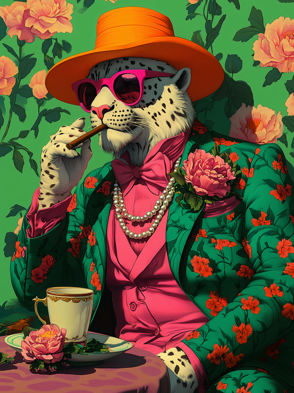 Hustler presenteert een charmante en humoristische scène waarin een stijlvolle luipaard geniet van een verfijnde theepauze te midden van een weelderige bloemental. Gekleed in een felroze vest, oranje hoed en trendy zonnebril straalt dit katachtige karakter pure elegantie en zelfvertrouwen uit. De levendige kleuren van de bloemen en het speelse contrast tussen wilde natuur en geciviliseerde manieren creëren een vrolijke, satirische sfeer. Dit eigentijdse kunstwerk brengt humor en kleur in elke ruimte en nodigt uit tot een glimlach.