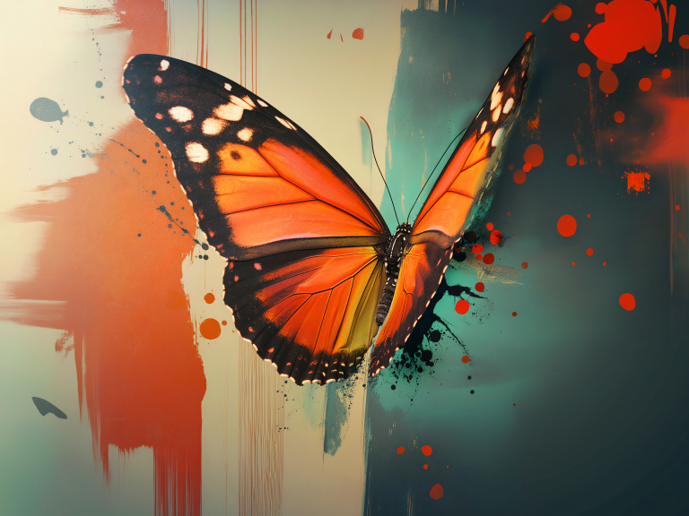 Monarch Butterfly presenteert een spectaculaire monarchvlinder die zweeft tussen explosieve verfstreken in warme oranje en koele blauwtinten. De abstracte achtergrond met druipende verf en spatten geeft dit natuurlijke wonder een moderne, artistieke twist die zowel kracht als kwetsbaarheid uitstraalt. Dit dynamische kunstwerk symboliseert transformatie en vrijheid op een manier die zowel energiek als elegant is. Perfect voor wie houdt van natuurlijke schoonheid gecombineerd met hedendaagse kunstzinnige expressie.