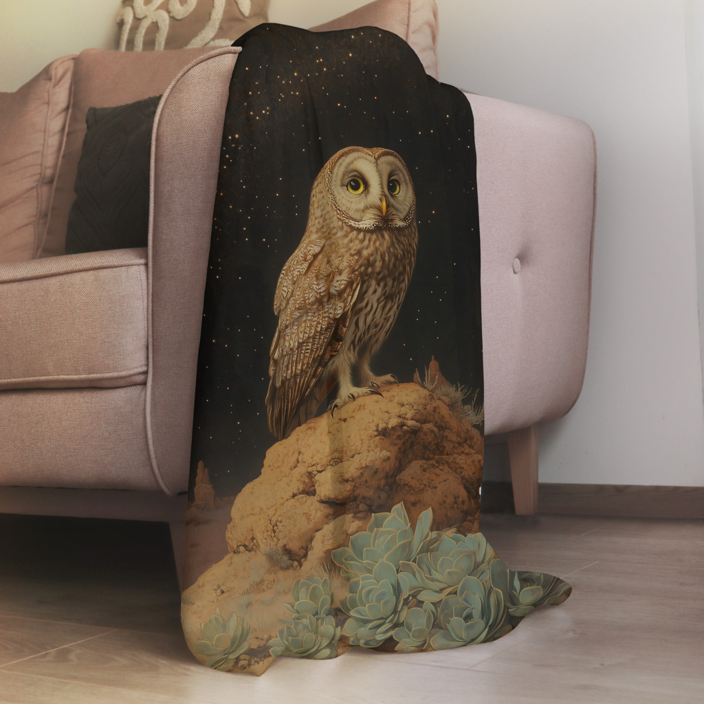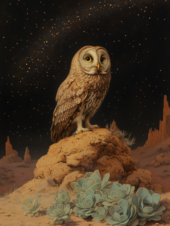 Night Owl toont een wijze uil die waakt over een mystiek woestijnlandschap onder een sterrenrijke hemel. De majestueuze vogel zit trots op een rotsformatie omgeven door delicate succulenten, terwijl duizenden sterren fonkelen in de diepe nachtelijke hemel. De warme aardetinten van de woestijnbodem contrasteren prachtig met de koele tinten van de nacht, wat een gevoel van serene contemplatie creƫert. Dit betoverende kunstwerk brengt de mystiek van de nacht en de wijsheid van de natuur samen in een tijdloze compositie.