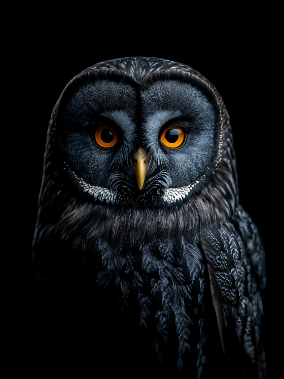 Black Owl presenteert een magistrale close-up van een mystieke uil wiens doordringende oranje ogen direct contact maken met de kijker. De donkere, fluweelzachte veren contrasteren prachtig met de warme gloed van de ogen, terwijl elke veertextuur en elke nuance van het gevederte zichtbaar wordt. De intense blik en de symmetrische compositie geven dit kunstwerk een krachtige, monumentale uitstraling. Dit meesterwerk brengt de wijsheid en mystiek van de nacht rechtstreeks in je leefruimte.