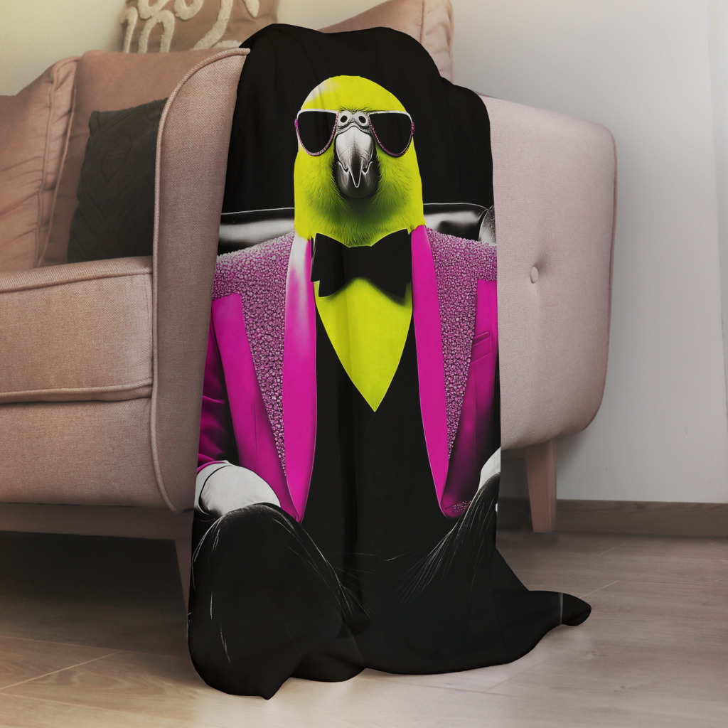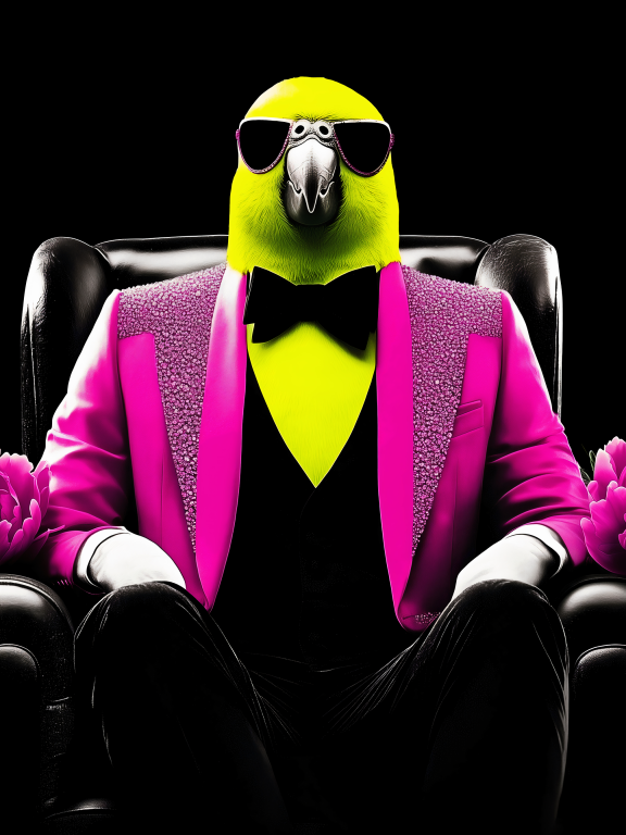 Een levendig, surrealistisch portret van een kanarie in een opvallende roze smoking met glinsterende accenten. De vogel, gezeten in een lederen fauteuil, straalt zelfverzekerdheid en glamour uit, versterkt door een zonnebril en een zwarte strik. Het contrastrijke kleurenschema van fel geel en roze op een donkere achtergrond geeft het werk een moderne, humoristische en bijna koninklijke uitstraling.