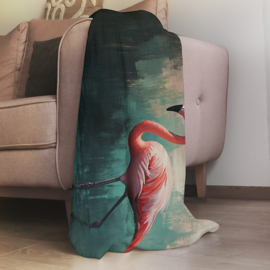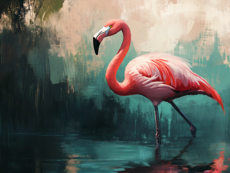 Walking Flamingo toont een elegante roze flamingo die graceus door ondiep water waadt tegen een artistieke achtergrond van verweerde turquoise en beige tinten. De expressieve penseelstreken en de abstracte kleurvlakken geven het realistische vogel portret een moderne, eigentijdse uitstraling. De zachte reflectie van de flamingo in het water en de gestructureerde achtergrond creƫren een perfect evenwicht tussen natuurlijke schoonheid en artistieke interpretatie. Dit verfijnde kunstwerk brengt de elegantie van deze iconische vogel tot leven in een contemporary stijl.