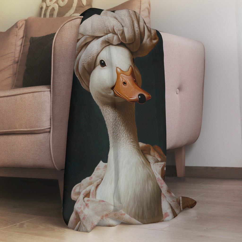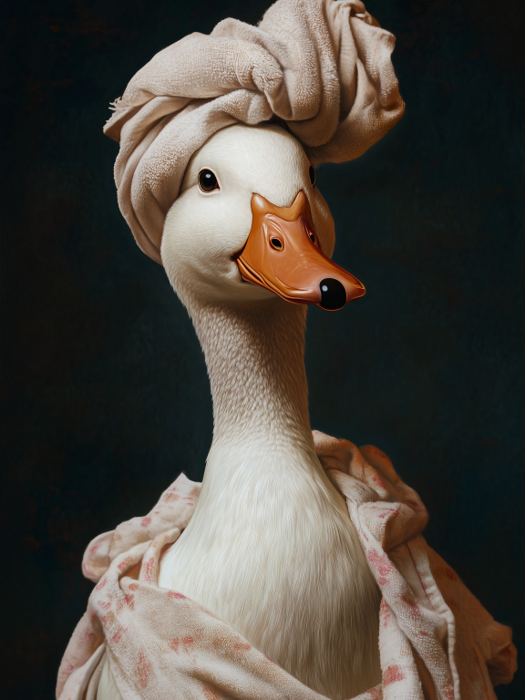 Vanity Duck presenteert een humoristische interpretatie waarin een elegante eend poseert als een klassiek portret, compleet met een luxueuze beige hoofddoek die in dramatische plooien valt. De serene uitdrukking en de verfijnde houding van de eend contrasteren amusant met haar natuurlijke eenden-eigenschappen, wat een speelse kijk geeft op klassieke portraitschilderkunst. De rijke texturen van de stof en de subtiele belichting tonen respect voor traditionele schildertechnieken. Dit charmante kunstwerk combineert humor met klassieke elegantie en brengt een glimlach in elke ruimte.
