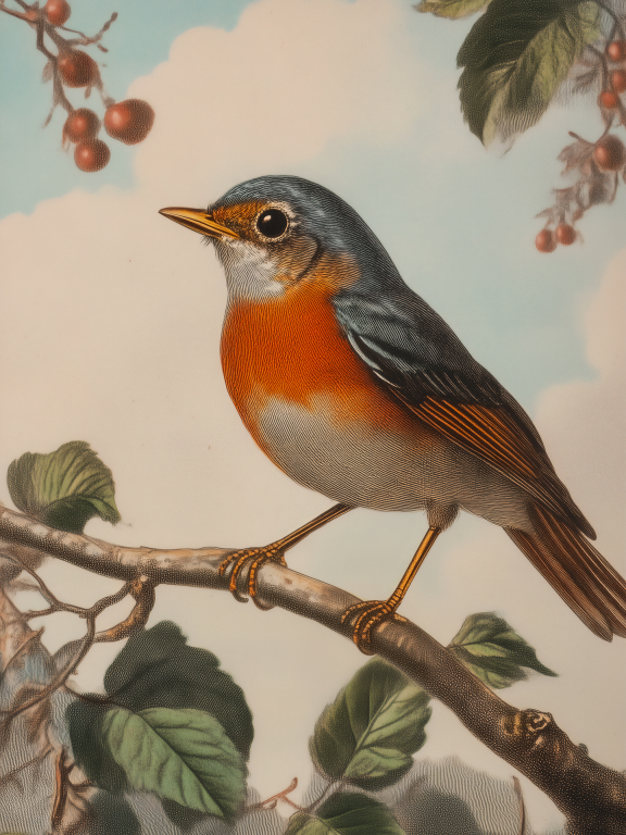 Red Robin presenteert een charmant roodborstje dat elegant poseert tussen de takken van een wilde kersenboom vol rijpe vruchten. De warme oranje borstkleur van het vogeltje contrasteert prachtig met de zachte neutrale tinten van de bladeren en de delicate besjes. Deze botanische vogelstudie in vintage stijl straalt rust en natuurlijke schoonheid uit, perfect voor wie houdt van klassieke natuurillustraties. Een tijdloze toevoeging die elke ruimte een gevoel van sereniteit en verbondenheid met de natuur geeft.