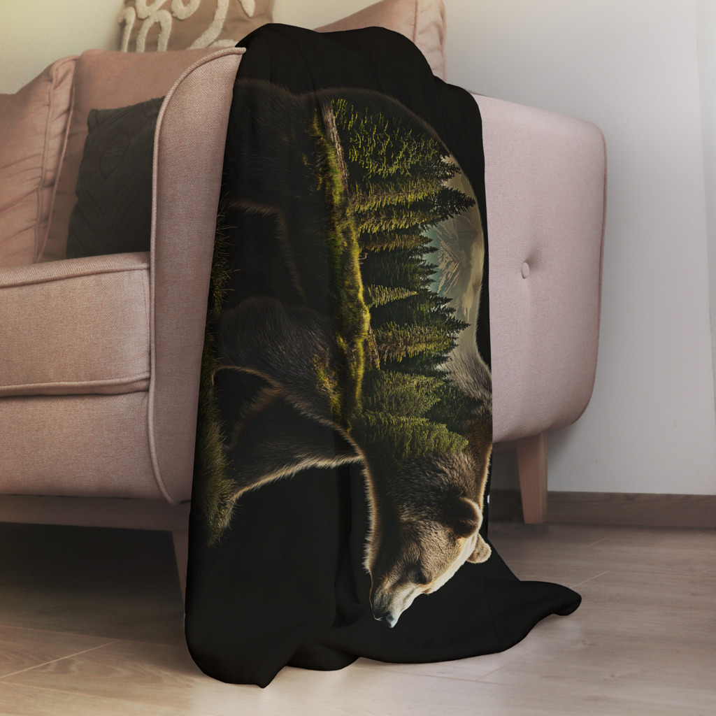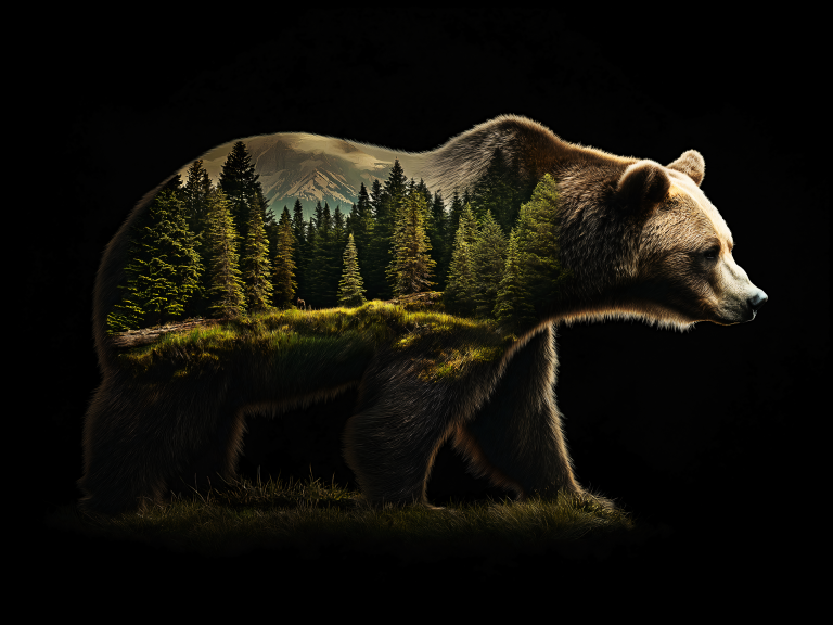 Forest Bear toont een fascinerend dubbel beeld waarin het silhouet van een beer een compleet boslandschap herbergt. De warme groentinten van dennenbomen en bergen vloeien naadloos over in de vorm van dit majestueuze dier, een poëtische weergave van de diepe verbondenheid tussen dier en habitat. Dit conceptuele kunstwerk symboliseert de onlosmakelijke band tussen natuur en haar bewoners. Perfect voor natuurliefhebbers die houden van kunst met een diepere betekenis.