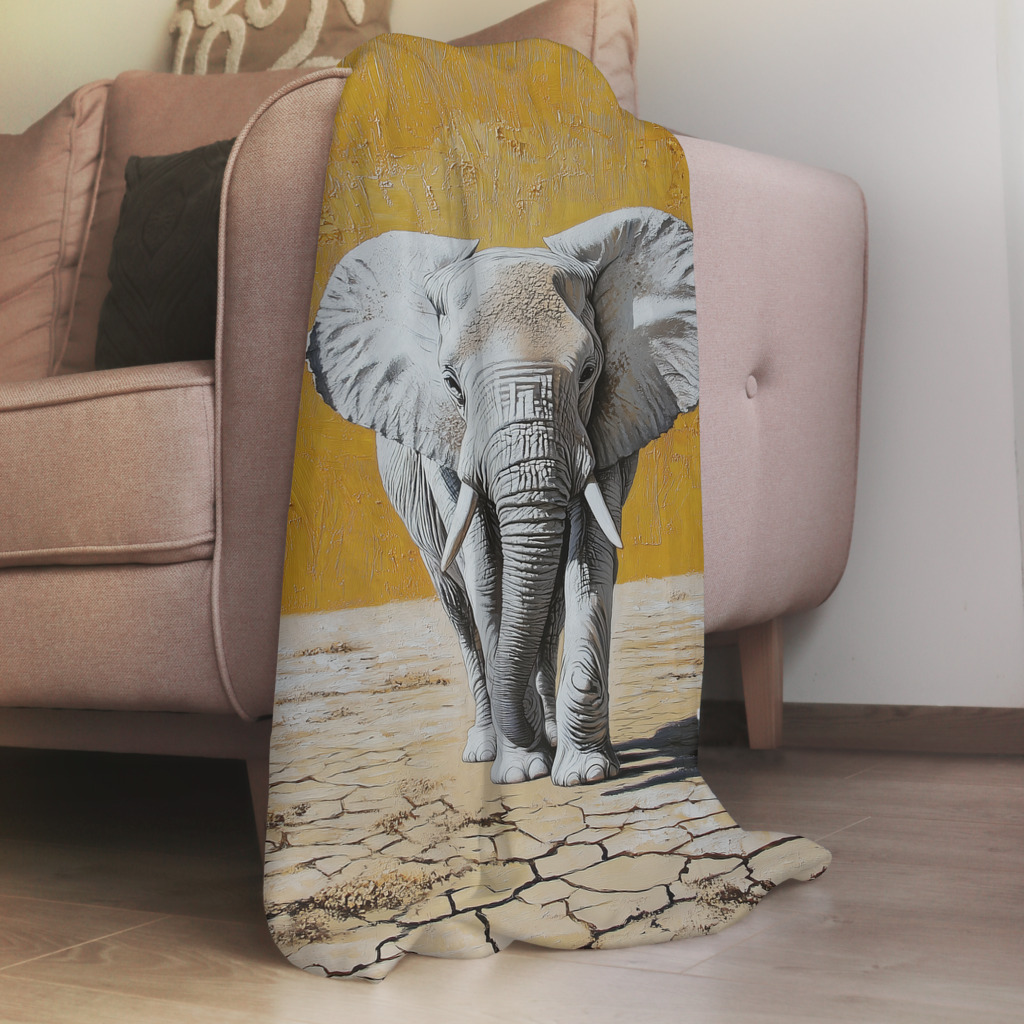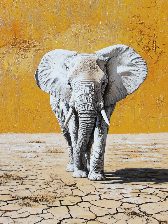 Elephant Desert toont een majestueuze olifant die standvastig doorheen een uitgedroogd landschap wandelt, waarbij de gebarsten aarde onder zijn poten de kracht van de natuur symboliseert. De imposante verschijning van het dier contrasteert prachtig met de warme, gouden achtergrond die de atmosfeer van de Afrikaanse savanne oproept. Elke rimpel en detail van de olifantshuid is zorgvuldig weergegeven, wat de waardigheid en wijsheid van dit iconische dier benadrukt. Dit krachtige kunstwerk brengt de grandeur van de wilde natuur direct in je leefruimte.