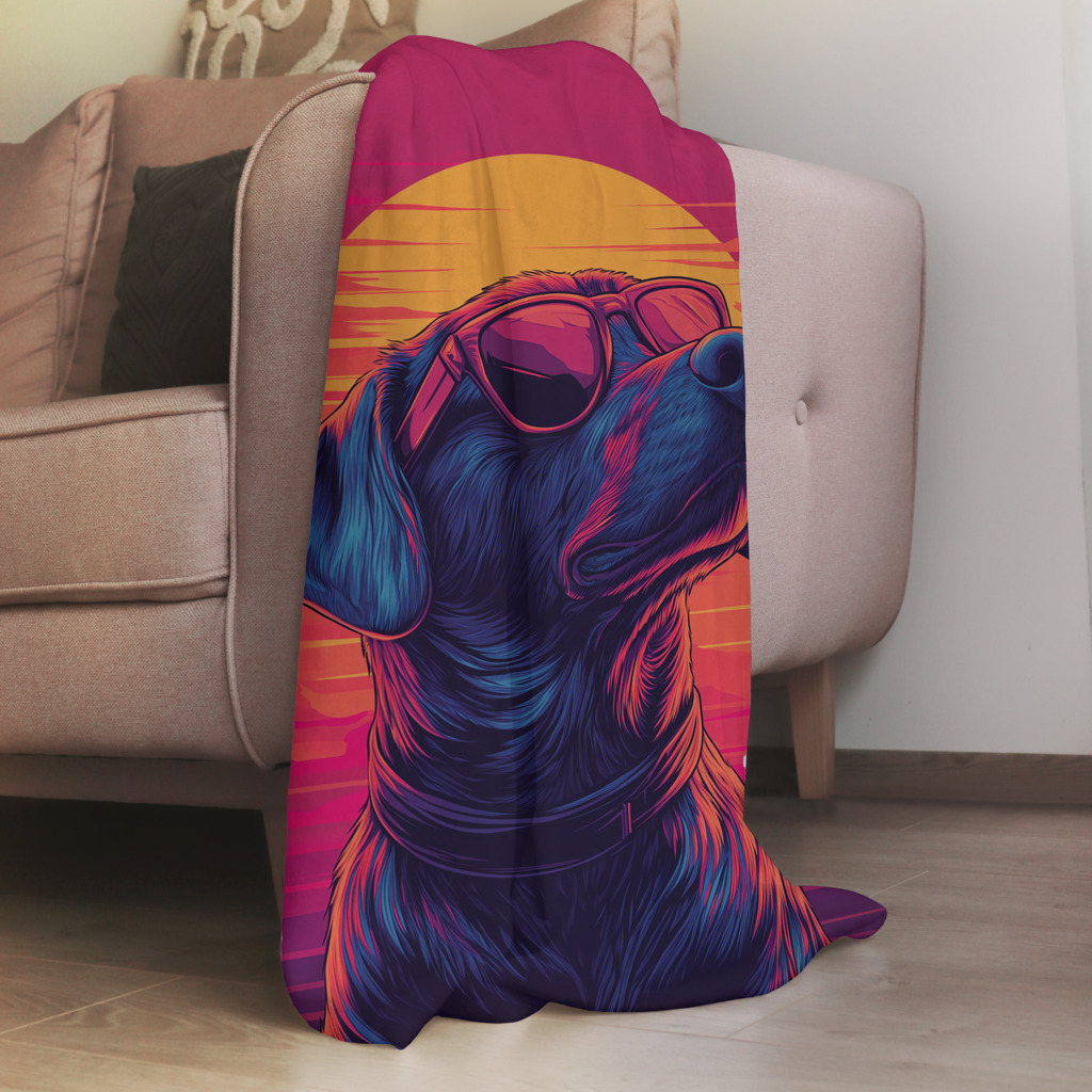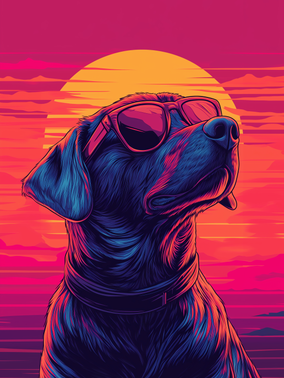 Fluffbutt straalt pure coolheid uit met deze stoere hond die met zonnebril poseert tegen een spectaculaire retro zonsondergang. De levendige neon kleuren van roze, oranje en blauw creëren een nostalgische jaren 80 sfeer die instant een glimlach op je gezicht tovert. Dit humoristische portret combineert de trouwe blik van man’s beste vriend met hippe retro-wave esthetiek. Perfect voor hondenliefhebbers die houden van een vleugje humor en vintage flair in hun interieur.