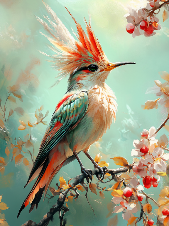 Een exotische prachtvogel schittert in Crowned Hoopoe, waar levendige kleuren en verfijnde details samenkomen. Met zijn opvallende kuif in vurige rood- en oranjetinten straalt deze vogel elegantie en kracht uit. De iriserende vleugels en zachte pastelachtergrond creëren een dromerig contrast, terwijl bloesemtakken het tafereel een poëtische touch geven. Dit kunstwerk brengt natuur en fantasie in perfecte harmonie, een stijlvolle blikvanger voor elk interieur.
