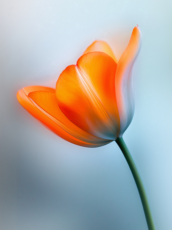 Prismatic Tulip toont een enkele tulp die baadt in etherisch licht, waarbij de bloemblaadjes gloeien in warme oranje tinten tegen een zachte pastelachtergrond. De transparante kwaliteit van de bloem onthult elke delicate ader en textuur, terwijl het licht speels door de blaadjes danst. Dit minimalistische meesterwerk viert de pure essentie van Nederlandse bloemenschoonheid. Perfect voor liefhebbers van botanische elegantie en de tijdloze charme van tulpen.