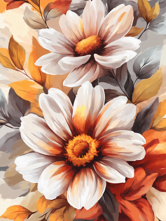 Double Daisy toont een prachtige dubbele compositie van twee magnolia-achtige bloemen die centraal staan in een warm herfsttafereel. De witte bloemblaadjes met hun oranje accenten contrasteren schitterend met de rijke herfstkleuren van het omringende bladwerk. De gedetailleerde weergave van elke vezel en textuur, gecombineerd met de zachte natuurlijke overgangen tussen de tinten, creƫert een gevoel van pure botanische schoonheid. Dit elegante kunstwerk brengt de tijdloze charme van een bloementuin direct in je interieur.