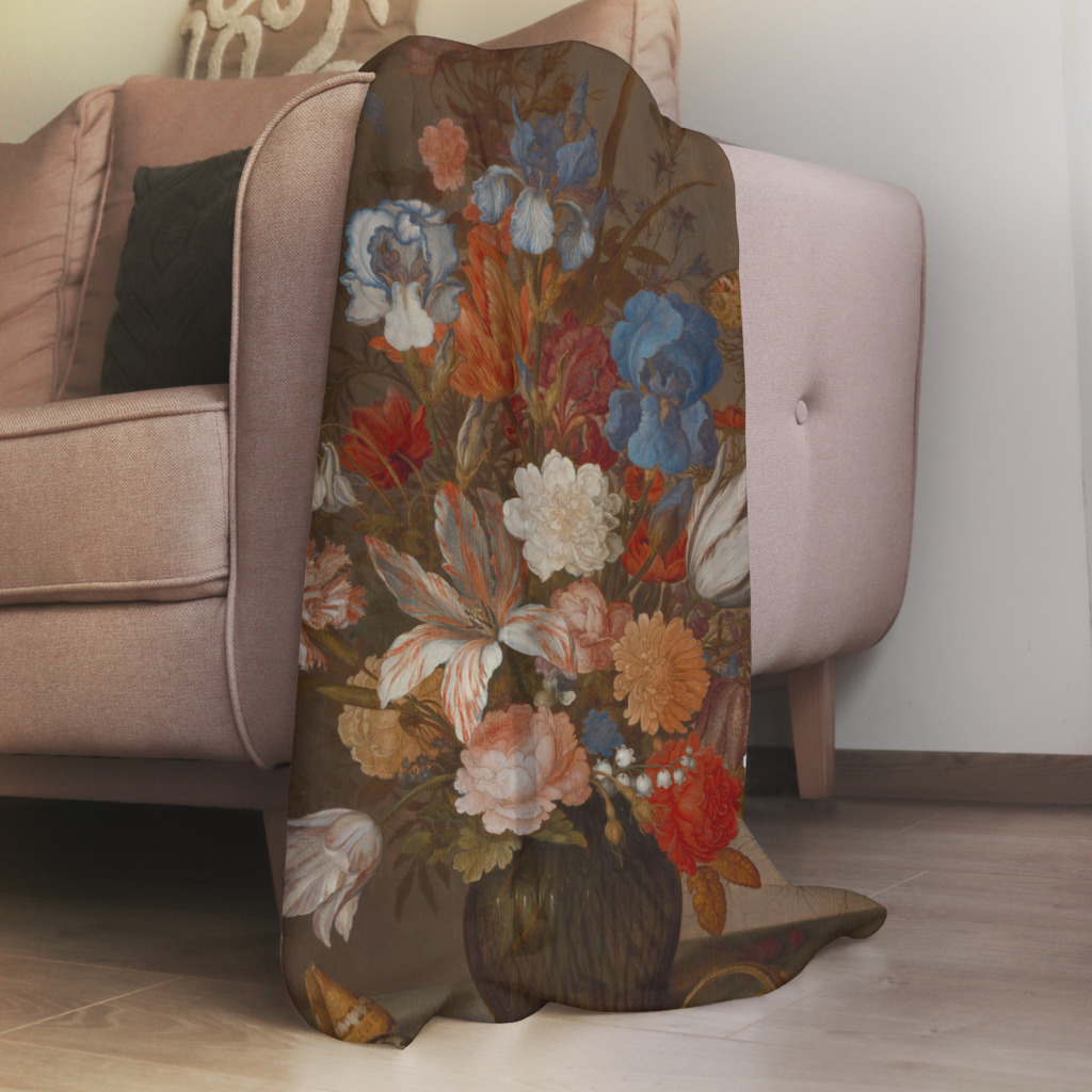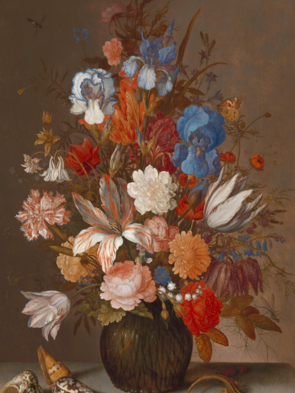 Stilleven met Bloemen is een weelderig bloemstilleven dat de rijkdom en diversiteit van de natuur viert. In een donkere vaas ontplooit zich een explosie van kleur en vorm - blauwe irissen mengen zich met witte lelies, terwijl warme oranje tinten en dieprode accenten voor levendigheid zorgen. De compositie wordt verrijkt door subtiele details zoals schelpen op de voorgrond, die verwijzen naar de vergankelijkheid van schoonheid en de schatten van land en zee. Het meesterlijke gebruik van licht en schaduw geeft elke bloem zijn eigen karakter, van de fluweelzachte textuur van de bloemblaadjes tot de delicate nerven in de bladeren. Dit tijdloze werk belichaamt de Nederlandse stilleventraditie op zijn best - een viering van natuurlijke pracht met symbolische diepgang.