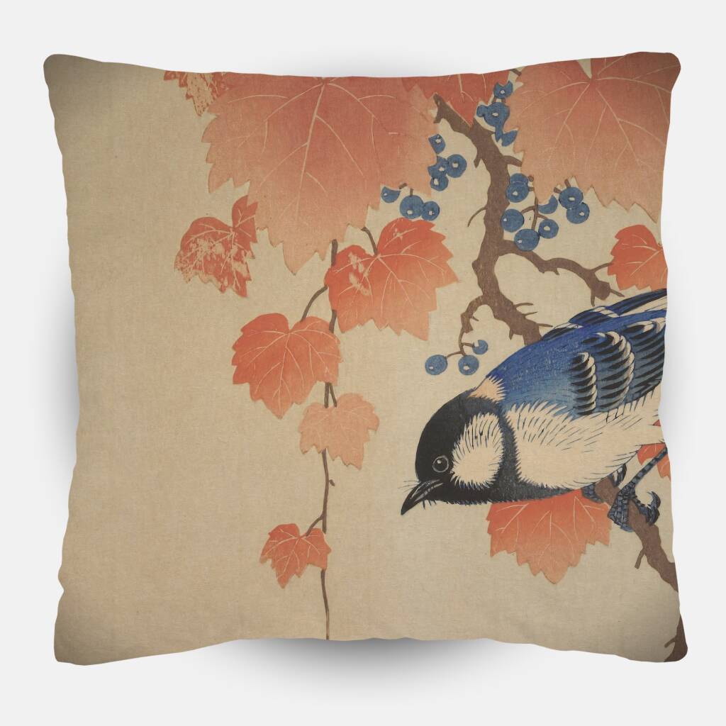 Koolmees op Paulownia Tak belichaamt de verfijnde schoonheid van de Japanse natuurkunst. Een levendige koolmees met zijn kenmerkende blauwe en witte verenkleed rust elegant op een sierlijke tak, omgeven door de warme herfsttinten van paulowniabladeren. De delicate blauwe bessen vormen een subtiel contrast met het terracottarood van het gebladerte, terwijl de zachte beige achtergrond de compositie een tijdloze sereniteit geeft. Dit kunstwerk vangt een vluchtig moment in de natuur met opmerkelijke precisie en gevoeligheid. De harmonische balans tussen de verschillende elementen - de dynamische vogel, de organische takken en het decoratieve gebladerte - creëert een visuele symfonie die zowel rust als levendigheid uitstraalt. Een klassiek voorbeeld van hoe natuurobservatie tot verheven kunst kan leiden.