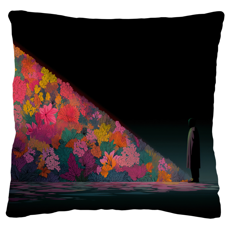 Bright Future presenteert een surrealistische scène waarin een eenzame figuur staat aan de rand van een explosie van kleuren. Een diagonale muur van levendige bloemen in alle tinten van de regenboog contrasteert met de donkere, mysterieuze ruimte erachter. Het contrast tussen licht en donker, tussen overvloed en leegte, symboliseert de overgang naar nieuwe mogelijkheden. Dit inspirerende kunstwerk moedigt aan om met vertrouwen de toekomst tegemoet te treden.