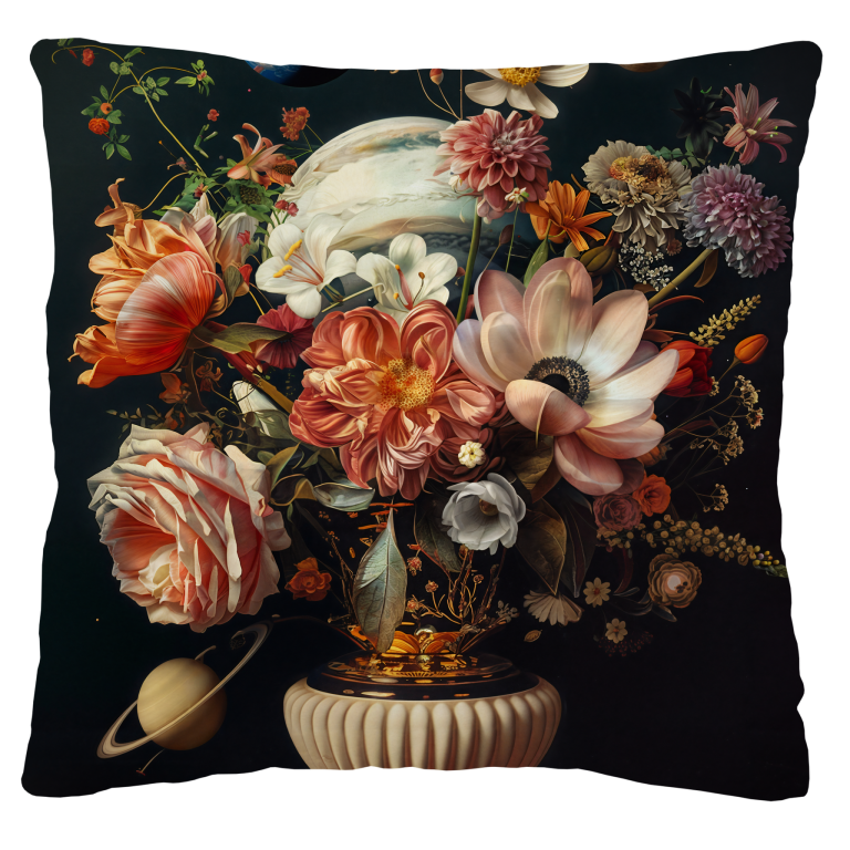 Planets Bouquet is een fascinerende samensmelting van natuur en kosmos, waarin een klassiek bloemstuk wordt verrijkt met zwevende planeten. De weelderige bloemen — van delicate rozen tot exotische lelies — bloeien in volle pracht uit een elegante, antieke vaas. Tussen de kleurrijke bloemblaadjes zweven planeten zoals Saturnus, Jupiter en de Aarde, wat het geheel een surrealistisch, dromerig gevoel geeft. De diepe, donkere achtergrond versterkt de levendige kleuren en creëert een gevoel van oneindigheid, alsof het boeket niet alleen de schoonheid van de natuur, maar ook de grootsheid van het universum symboliseert. Dit kunstwerk brengt een unieke balans tussen aardse pracht en buitenaardse mystiek.