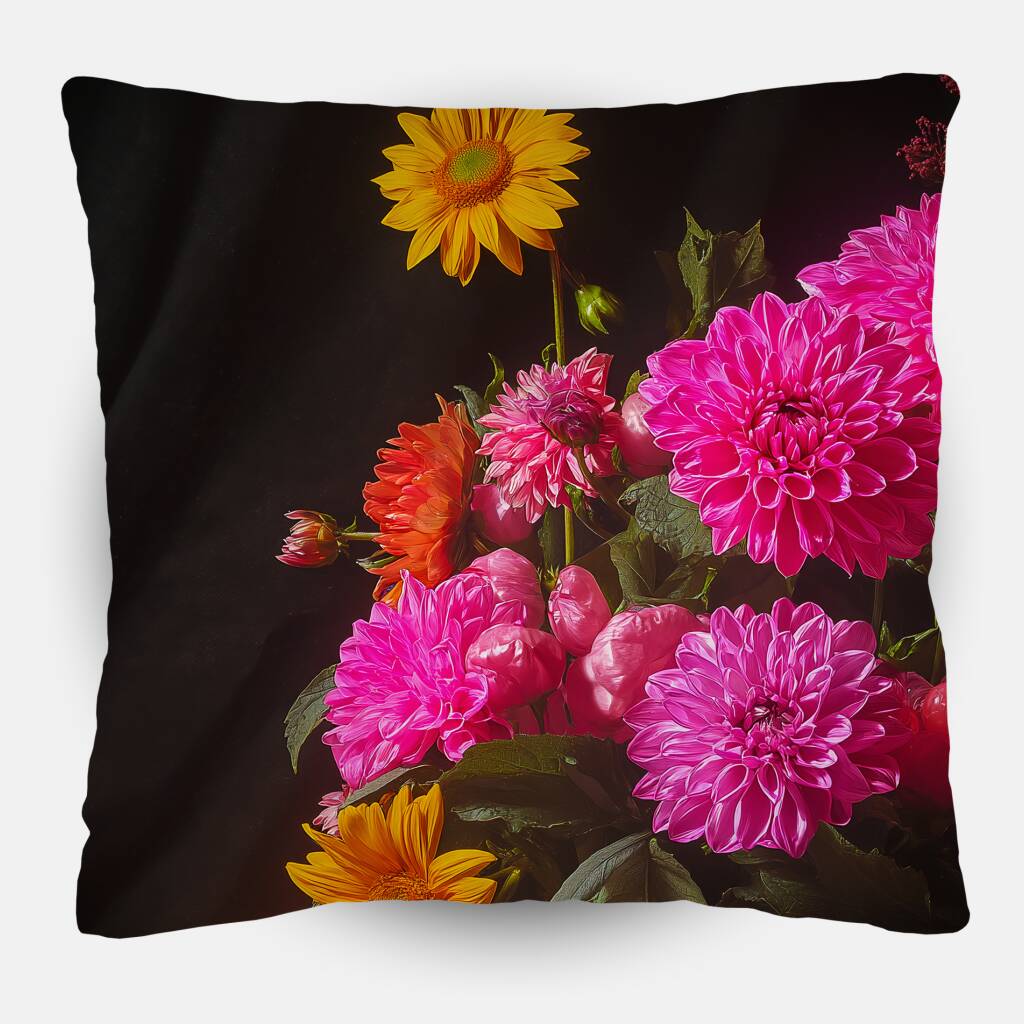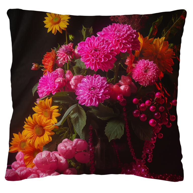 Pearly Pink Bouquet presenteert een luxueus boeket waarin roze dahlia’s, goudgele calendula’s en rode bessentakken samenkomen in een overdadige explosie van kleur en textuur. De donkere achtergrond laat elke bloem en bes schitteren als edelstenen, terwijl de parelachtige glans van de roze tinten het geheel een glamoureuze uitstraling geeft. Dit weelderige stilleven straalt romantiek en overvloed uit, perfect voor wie houdt van rijke kleuren en botanische pracht.