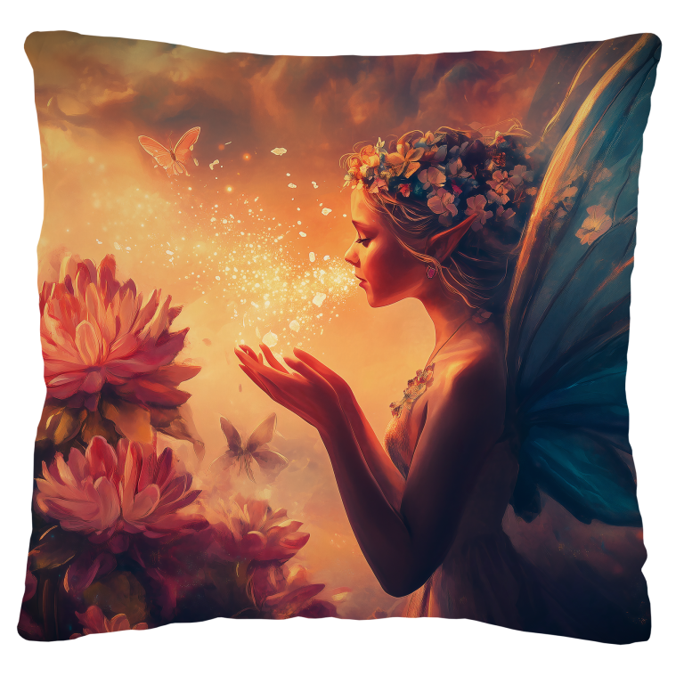 Pixie Love toont een betoverende fee met delicate blauwe vleugels die magisch stof blaast over een tuin vol gouden dahlia’s bij zonsondergang. De warme amberkleurige gloed en de dromerige sfeer creëren een sprookjesachtige wereld waar fantasie en natuur samensmelten. Dit romantische kunstwerk straalt pure magie en kinderlijke verwondering uit. Perfect voor dromerige zielen die geloven in de schoonheid van fantasie en de kracht van verbeelding in hun dagelijks leven.