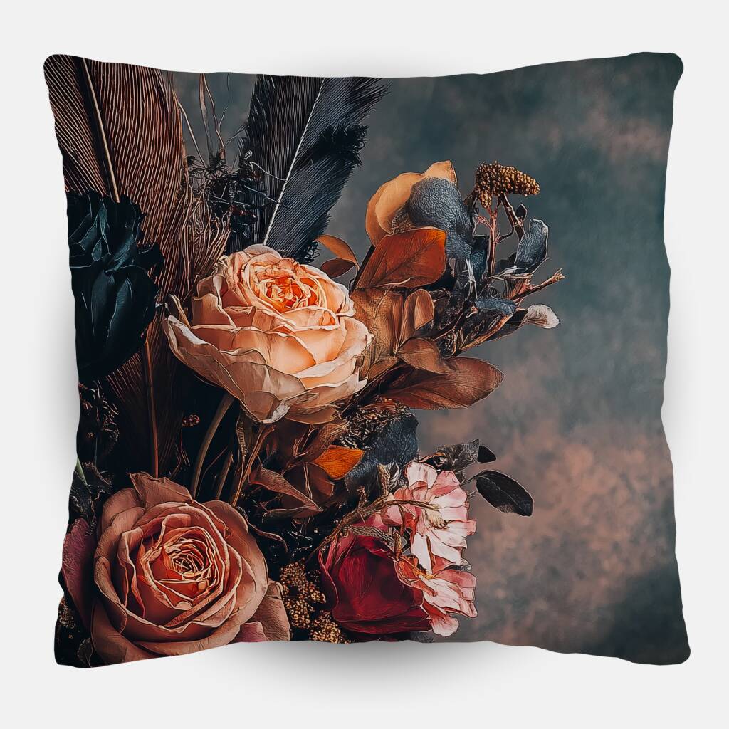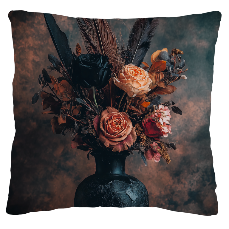Withering Bouquet toont de poëtische schoonheid van vergankelijkheid waar verwelkende bloemen hun laatste dans uitvoeren in een donkere, klassieke vaas. De warme amber- en koperkleuren contrasteren prachtig met de mysterieuze achtergrond, terwijl de dramatische belichting elke roos en veer tot leven brengt. Dit melancholieke meesterwerk spreekt tot de ziel en herinnert ons aan de kostbare schoonheid van elk moment. Een indrukwekkende keuze voor liefhebbers van romantische en gotische esthetiek.