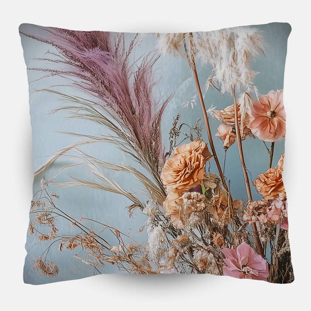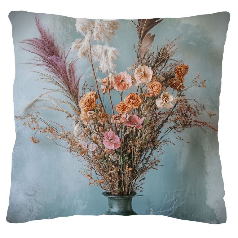 Dried Bouquet toont een nostalgische stilleven compositie waarin gedroogde bloemen en siergrassen zijn samengebracht in een elegante vaas. De zachte beige en bruine tinten van de gedroogde botanische elementen contrasteren subtiel met de verweerde blauwe achtergrond, die de charme van vergane tijd uitstraalt. De delicate texturen van pampagras en gedroogde bloemen creëren een gevoel van rustieke elegantie en natuurlijke schoonheid. Dit tijdloze kunstwerk brengt de serene sfeer van een landelijk interieur direct in je leefruimte.