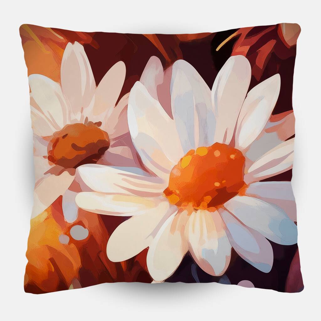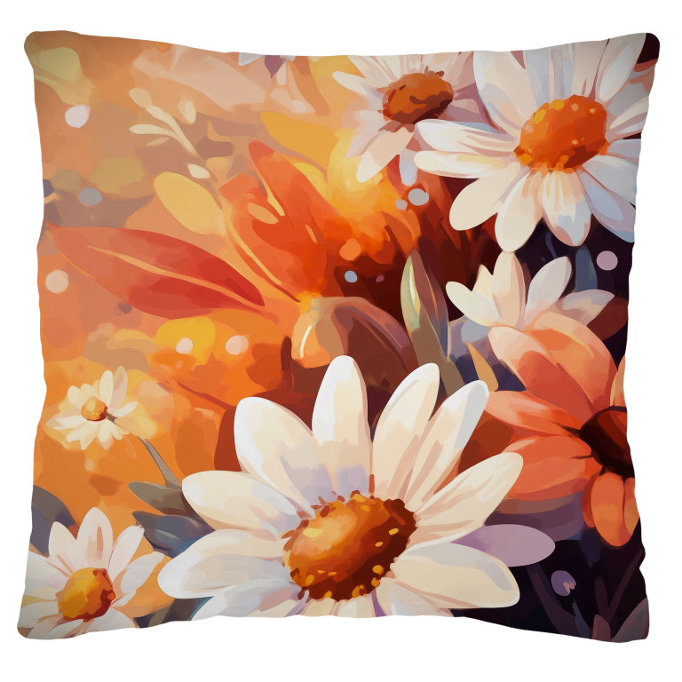 Daisies toont een levendige collectie van witte madeliefjes die baden in warm zonlicht en omgeven worden door een symfonie van oranje en gouden tinten. De bloemen lijken te dansen in een zachte bries, waarbij hun witte blaadjes en goudgele hartjes een vrolijk contrast vormen met de warme, herfstachtige achtergrond. De impressionistische stijl en de zachte overgangen tussen de kleuren creëren een gevoel van pure vreugde en natuurlijke schoonheid. Dit opwekkende kunstwerk brengt de frisheid van een bloemenveld direct in je interieur.