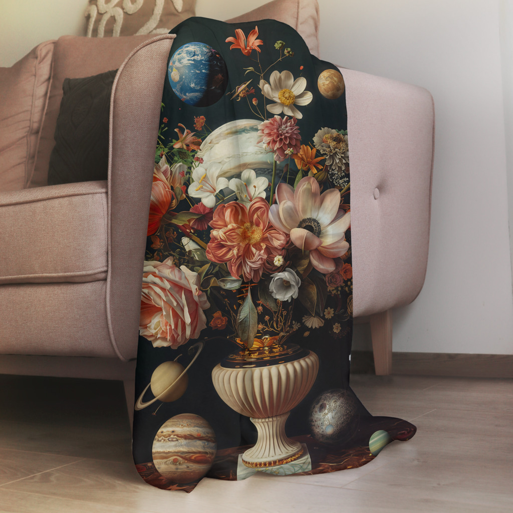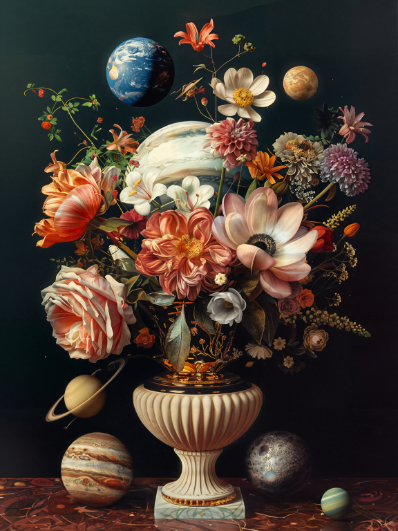 Planets Bouquet is een fascinerende samensmelting van natuur en kosmos, waarin een klassiek bloemstuk wordt verrijkt met zwevende planeten. De weelderige bloemen — van delicate rozen tot exotische lelies — bloeien in volle pracht uit een elegante, antieke vaas. Tussen de kleurrijke bloemblaadjes zweven planeten zoals Saturnus, Jupiter en de Aarde, wat het geheel een surrealistisch, dromerig gevoel geeft. De diepe, donkere achtergrond versterkt de levendige kleuren en creëert een gevoel van oneindigheid, alsof het boeket niet alleen de schoonheid van de natuur, maar ook de grootsheid van het universum symboliseert. Dit kunstwerk brengt een unieke balans tussen aardse pracht en buitenaardse mystiek.