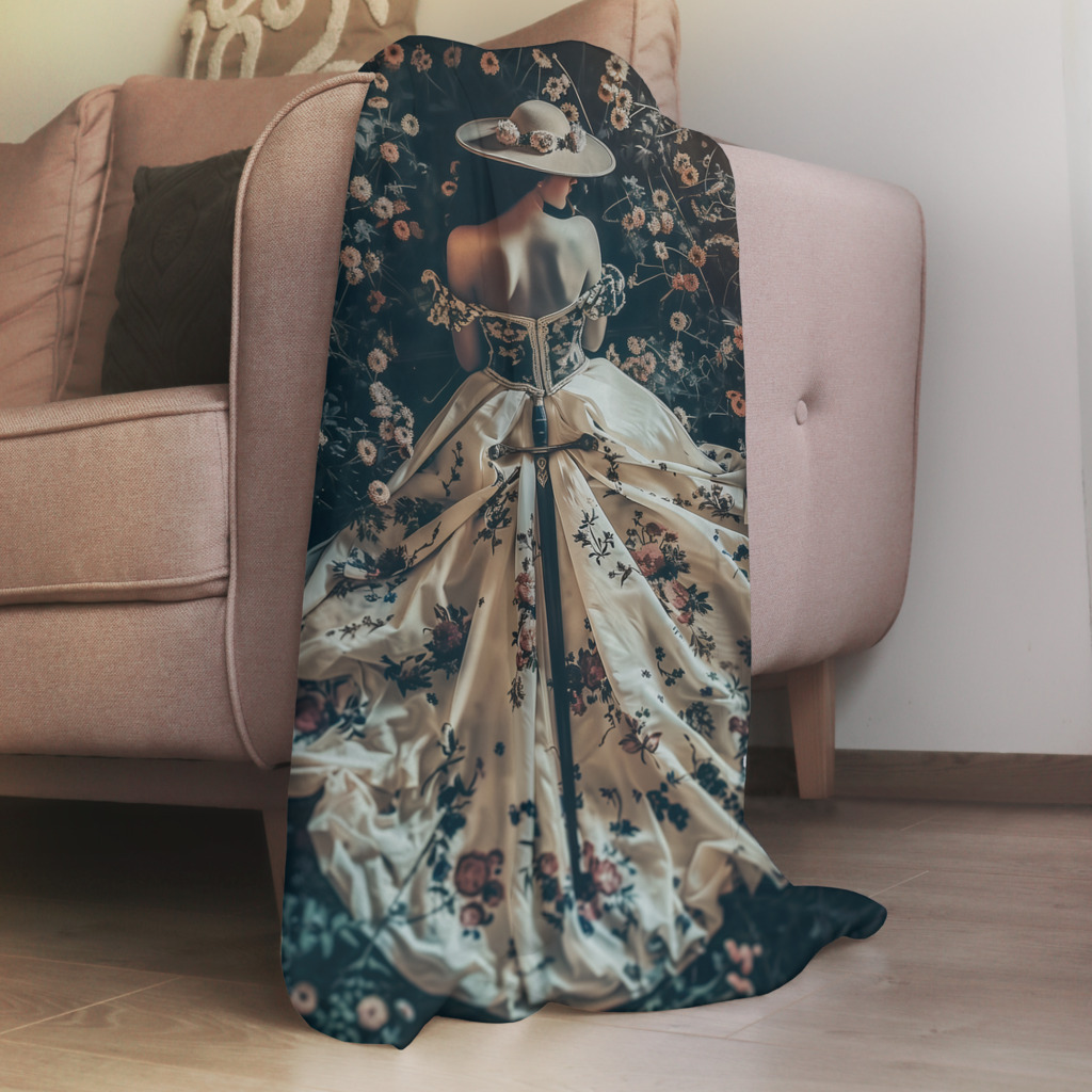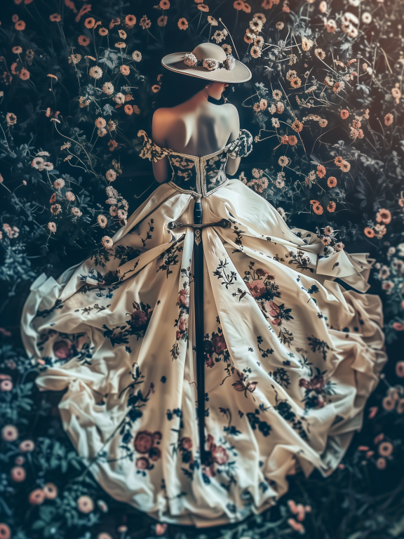 Een betoverende compositie waarin een vrouw wordt afgebeeld te midden van een weelderig veld vol bloemen. Haar elegante jurk, rijkelijk versierd met een bloemmotief, ligt uitgestrekt over de grond, terwijl haar houding en hoed een dromerige, bijna sprookjesachtige sfeer oproepen. De gedempte kleuren en het zachte licht creƫren een harmonieus samenspel tussen de vrouw en haar omgeving, die zowel romantiek als melancholie uitstraalt. Het tafereel voelt als een stil moment uit een verhaal vol mysterie en schoonheid.