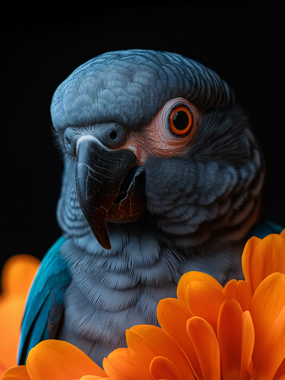 Grey Parrot presenteert een indrukwekkend portret van een Afrikaanse grijze roodstaartpapegaai, omringd door levendige oranje gerbera’s. De hyperrealistische weergave toont elk detail van de blauwe veren en de intelligente oranje ogen, terwijl de warme bloemen een prachtig contrast vormen met het koele grijs. Dit meesterlijke portret vangt zowel de wijsheid als de schoonheid van deze bijzondere vogel. Perfect voor vogelliefhebbers en bewonderaars van gedetailleerde natuurfotografie.