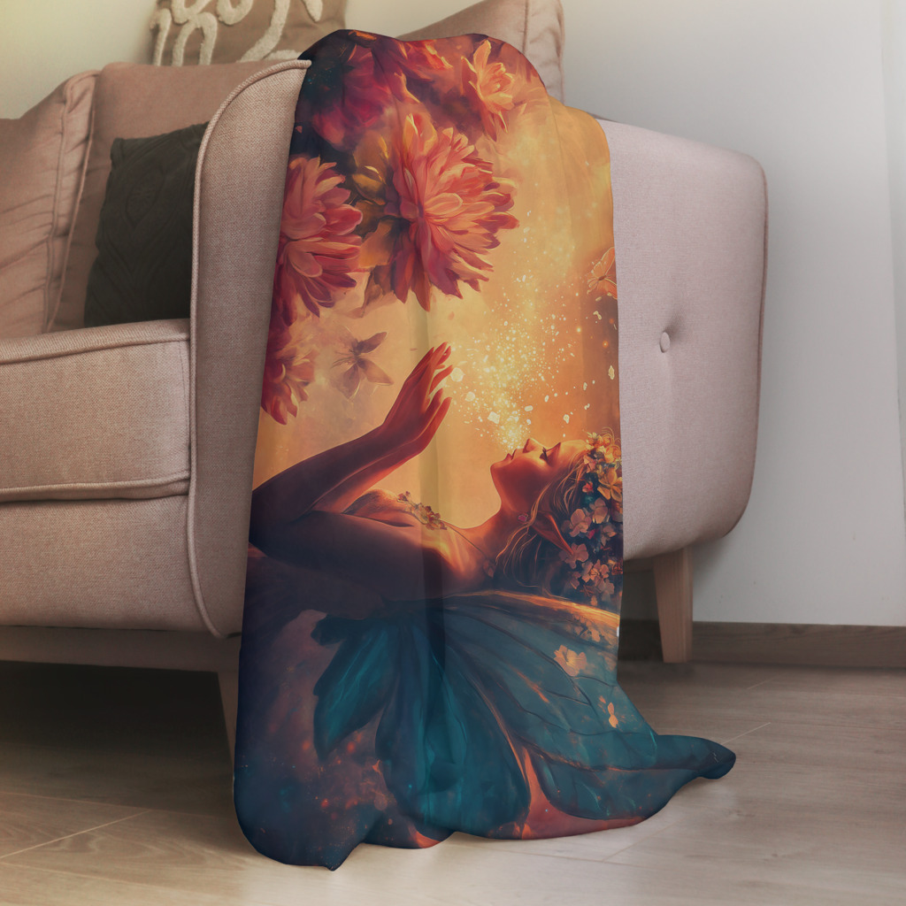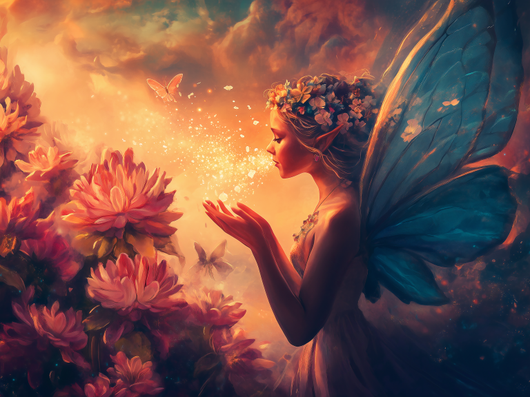 Pixie Love toont een betoverende fee met delicate blauwe vleugels die magisch stof blaast over een tuin vol gouden dahlia’s bij zonsondergang. De warme amberkleurige gloed en de dromerige sfeer creëren een sprookjesachtige wereld waar fantasie en natuur samensmelten. Dit romantische kunstwerk straalt pure magie en kinderlijke verwondering uit. Perfect voor dromerige zielen die geloven in de schoonheid van fantasie en de kracht van verbeelding in hun dagelijks leven.