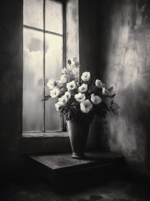 Monochrome Bouquet toont een verstild stilleven waar delicate witte bloemen het zachte licht vangen dat door een raam naar binnen valt. De klassieke zwart-wit compositie en het subtiele spel van licht en schaduw creëren een sfeer van tijdloze elegantie en melancholie. Dit poëtische beeld herinnert aan de schoonheid van eenvoud en de kracht van monochrome fotografie. Perfect voor liefhebbers van klassieke stillevens en de serene schoonheid van zwart-wit kunst.