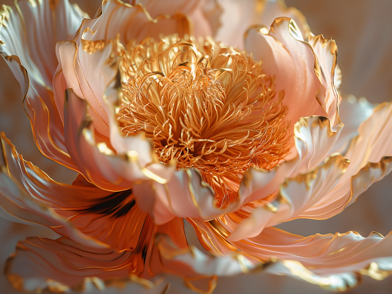 Pinkish Peony toont een betoverende pioenroos in zachte koperachtige en roze tinten die lijkt te zweven als vloeibare zijde. De delicate bloemblaadjes golven en krullen in een dans van natuurlijke elegantie, waarbij elk detail van de complexe bloemstructuur zichtbaar is. Dit artistieke meesterwerk vangt de essentie van vrouwelijke schoonheid en natuurlijke gratie. Perfect voor romantische zielen die houden van zachte luxe en botanische kunst met een moderne twist.