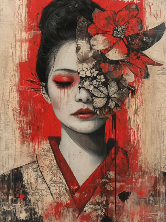 Floral Japan toont een betoverend portret waarin Oosterse schoonheid en bloemenpoƫzie samenvloeien in een moderne interpretatie van traditionele Japanse kunst. De dieprode accenten en delicate bloesems tegen de verweerde achtergrond creƫren een krachtig contrast tussen kwetsbaarheid en kracht. Dit kunstwerk combineert geisha-esthetiek met contemporary street art, waarbij elke penseelstreek een verhaal vertelt van culturele fusie. Perfect voor liefhebbers van Aziatische kunst die verlangen naar een eigentijdse twist op klassieke schoonheid.