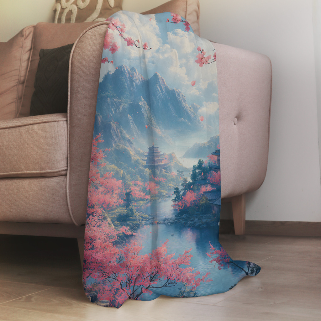 Peaceful Valley toont een betoverend Aziatisch landschap waarin een serene rivier zich slingert door een vallei vol roze kersenbloesems. De traditionele tempels en paviljoens nestelen zich harmonieus tussen de bloeiende bomen, terwijl majestueuze bergen zich verheffin in de mistige verte. De zachte pastelkleuren en de dromerige atmosfeer creëren een gevoel van pure tranquilliteit en spirituele rust. Dit poëtische kunstwerk brengt de tijdloze schoonheid van de Oosterse natuur en architectuur in een perfect evenwicht van sereniteit en elegantie.