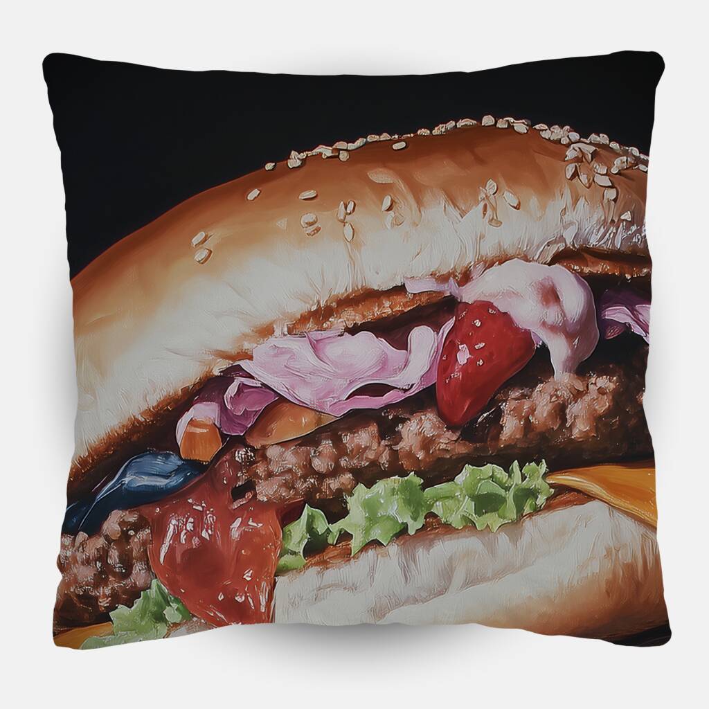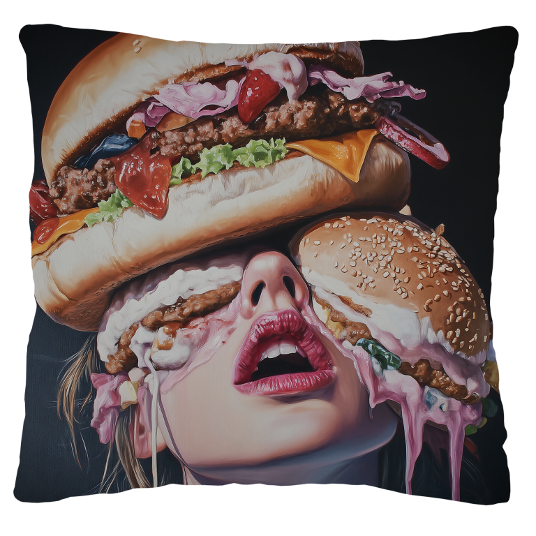 Junkfood presenteert een surreële en humoristische scène waarin een vrouw wordt overspoeld door een cascade van hamburgers die uit de lucht lijken te vallen. De hyperrealistische weergave van de fast food contrasteert op speelse wijze met de serene uitdrukking van het model, wat een satirisch commentaar vormt op onze moderne consumptiecultuur. De rijke kleuren en de gedetailleerde texturen van de hamburgers creëren een visueel spektakel dat zowel appetijtelijk als overweldigend is. Dit provocerende kunstwerk brengt humor en sociale kritiek samen in een unieke visuele ervaring.