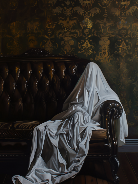 Never Alone presenteert een mysterieuze en intrigerende scène waarin een figuur gehuld in witte stof rust op een klassieke leren chesterfield bank in een statige victorionale kamer. De donkere, rijke achtergrond met zijn ornamentele behang contrasteert dramatisch met de lichte, etherische verschijning van de figuur. De sfeer roept vragen op over identiteit, eenzaamheid en aanwezigheid, terwijl de elegante inrichting een tijdloos gevoel van mystiek uitstraalt. Dit thought-provoking kunstwerk nodigt uit tot contemplatie en brengt een element van artistiek mysterie in je interieur.