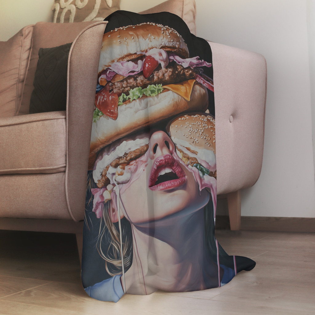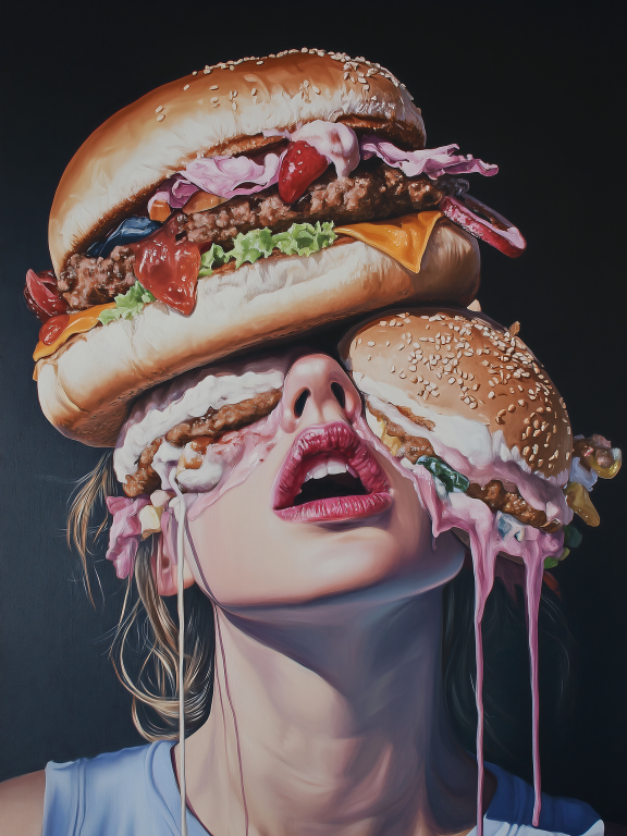 Junkfood presenteert een surreële en humoristische scène waarin een vrouw wordt overspoeld door een cascade van hamburgers die uit de lucht lijken te vallen. De hyperrealistische weergave van de fast food contrasteert op speelse wijze met de serene uitdrukking van het model, wat een satirisch commentaar vormt op onze moderne consumptiecultuur. De rijke kleuren en de gedetailleerde texturen van de hamburgers creëren een visueel spektakel dat zowel appetijtelijk als overweldigend is. Dit provocerende kunstwerk brengt humor en sociale kritiek samen in een unieke visuele ervaring.